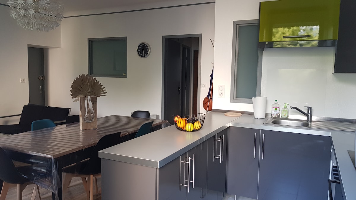 60 m2 lägenhet lugnt läge nära helgedomar och alla bekvämligheter, 1:a våningen med 2 sovrum har en dubbelsäng med bekväm madrass, vardagsrum med en mycket bekväm ribbad bäddsoffa, TV, bord 6 personer, soffbord, ett kök med alla redskap (bestick, kastruller) en mikrovågsugn, en kyl-frys, kaffebryggare, vattenkokare, brödrost. Gratis WIFI Gratis parkering nära boendet. Idealiskt beläget. Ni är välkomna.