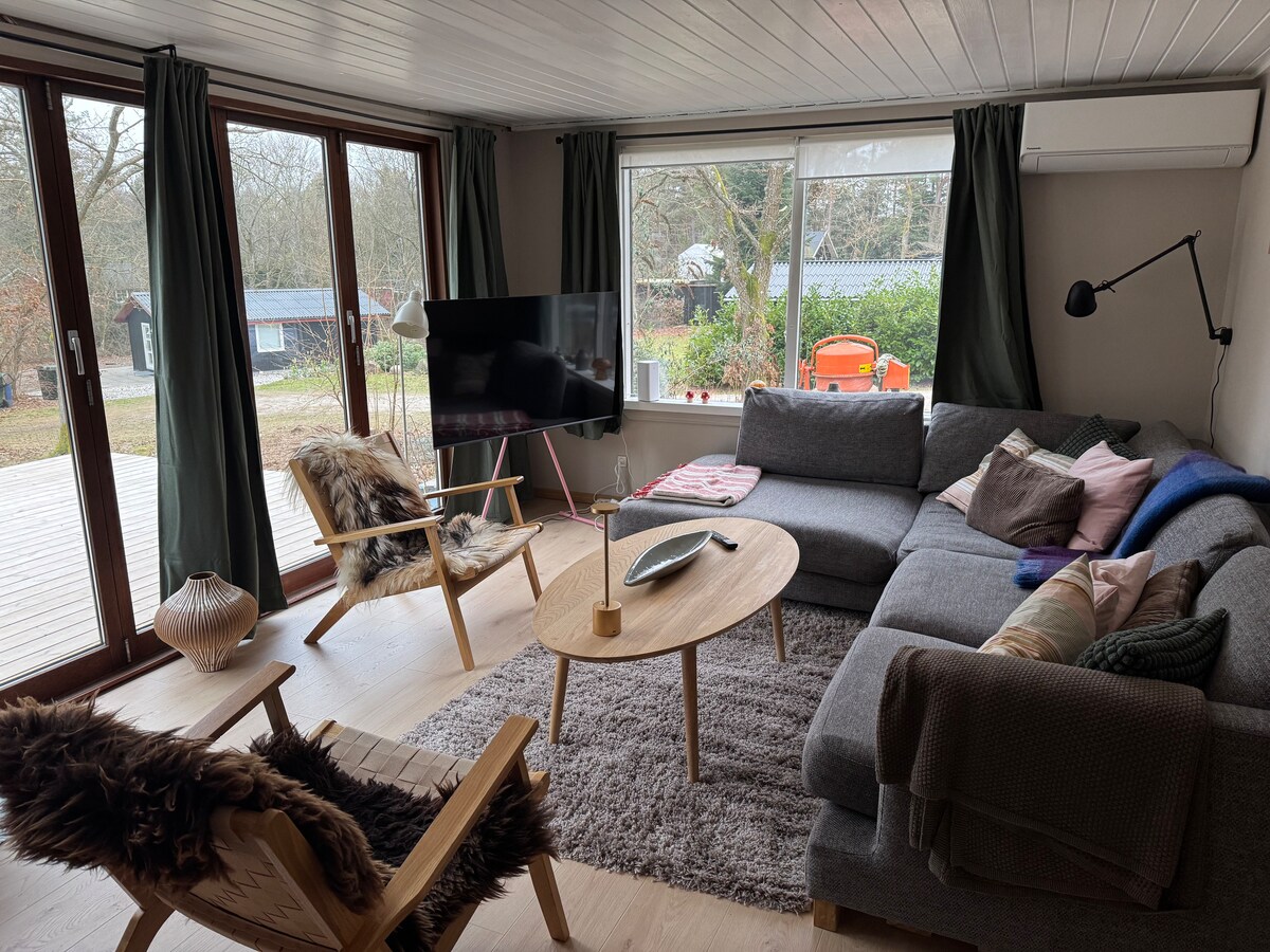 Mysig stuga på 138 kvm med gott om utrymme för 4 vuxna samt 4 barn och upp till 2 spädbarn i en resesäng. Sommarhuset är nyrenoverat. Min. 4 dagar utanför säsongen och 1 vecka under högsäsong. Slutstädning 850 DKK, - per vistelse. En vedkorg levereras med ved, ta med din egen ved. Förbrukning betalas enligt mätare, el 2,95 DKK per kWh, vatten och avlopp 89 DKK per m3, hyresvärden läser mätarna vid in- och utcheckning och skickar en avgift för faktisk förbrukning via Airbnb.