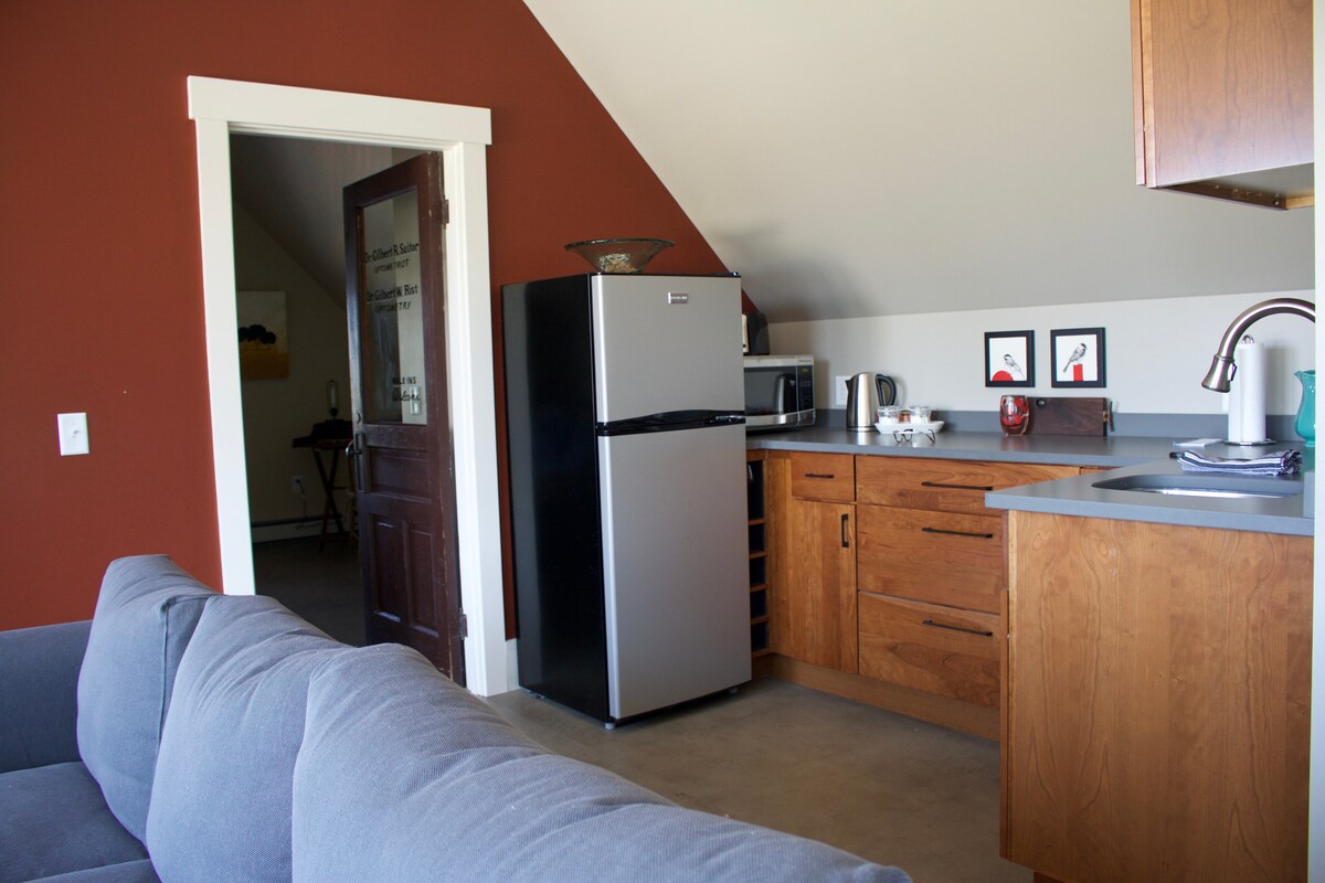 Njut av allt Burlington har att erbjuda i denna helt nya, mysiga, eleganta stuga. Detta bedårande hus färdigställdes i januari 2023 och har ett stort sovrum plus ett sovloft, samt ett fullstort badrum, tvättmaskin och torktumlare, och parkering. Matsalen/vardagsrummet har delvis utsikt över Lake Champlain! Du är undangömd på en lugn bostadsgata nära en park och lekplats men är bara 10 minuters promenad till centrum och 5 minuters promenad till sjön och en vacker strandcykelväg.