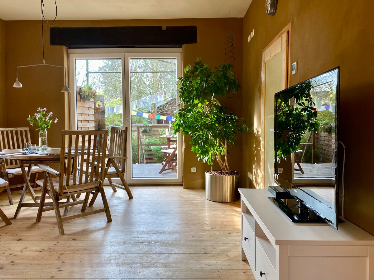 Ljust, högkvalitativt nytt, lägenhet 100m², fantastiskt läge och ändå nära till staden. 2 stora sovrum, arbetsplats, egen täckt solterrass och trädgård, mycket utrymme och avskildhet för dina vänner och/eller hela familjen upp till 6 personer. Anländ, må bra och börja bo direkt. Känn dig som hemma. Den nya moderna inredningen är vänlig och mysig. I den nya EBK är du chefen. Självcheck-in och gratis parkering vid huset gör det enkelt för dig att anlända.