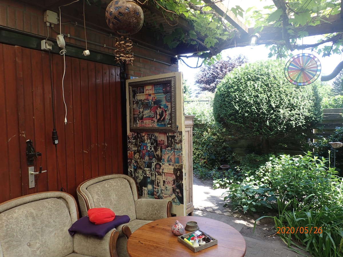 Välkommen till vårt 140 år gamla, mysiga bakhuusje på en idyllisk plats på en Klompenpad. Ett trevligt ställe för avkoppling tillsammans, omgivet av vandrings- och cykelvägar. Stugan är fullt möblerad för 4 personer med två sovrum (anslutna med trappor), ett mysigt vardagsrum, kök, dusch och separat toalett. Stor trädgård med massor av avskildhet, sol och skugga. Privat parkering och cykelskjul.