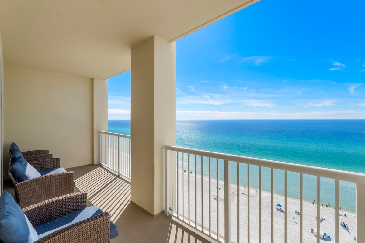 🏝 BÄST I PCB 🏝 Det blir inte mycket bättre än att vakna upp till en fantastisk havsutsikt från ditt stora sovrum och kliva direkt ut på en privat balkong med utsikt över de fantastiska soluppgångarna över golfen. Börja dagen med en varm kopp kaffe medan du njuter av det smaragdgröna vattnets fridfulla skönhet. På kvällen kan du koppla av med ett glas vin medan du tittar på delfiner som simmar förbi. Kliv direkt ut på den sockervita sandstranden, fäll ut dina stolar och njut av Floridas sol. Perfekt tillflykt