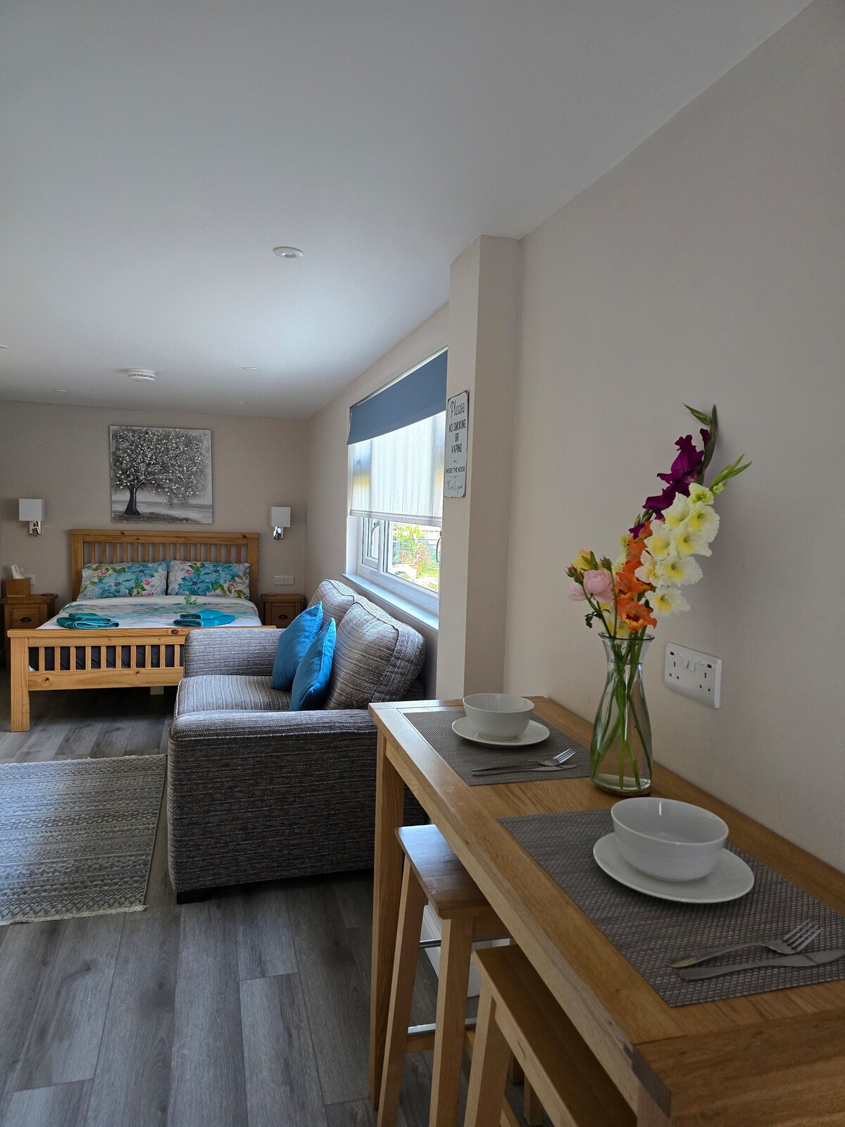 Den fristående studion omvandlades 2017 från en liten ladugård (cirka 1850) och kombinerar karaktär med smakfulla möbler. TOTAL RENOVERING MAJ 2025 med nytt pentry, golv, matta, träpaneler. Separat från huvudhuset med säkerhetsgrindar och 24 timmars övervakningskamera, vilket ger parkering, en utomhussittplats och utsikt över fåren och frigående kycklingar. Upton är en liten by, två miles från Southwell, med promenader på landet och en lokal pub som serverar ny tillagad mat.