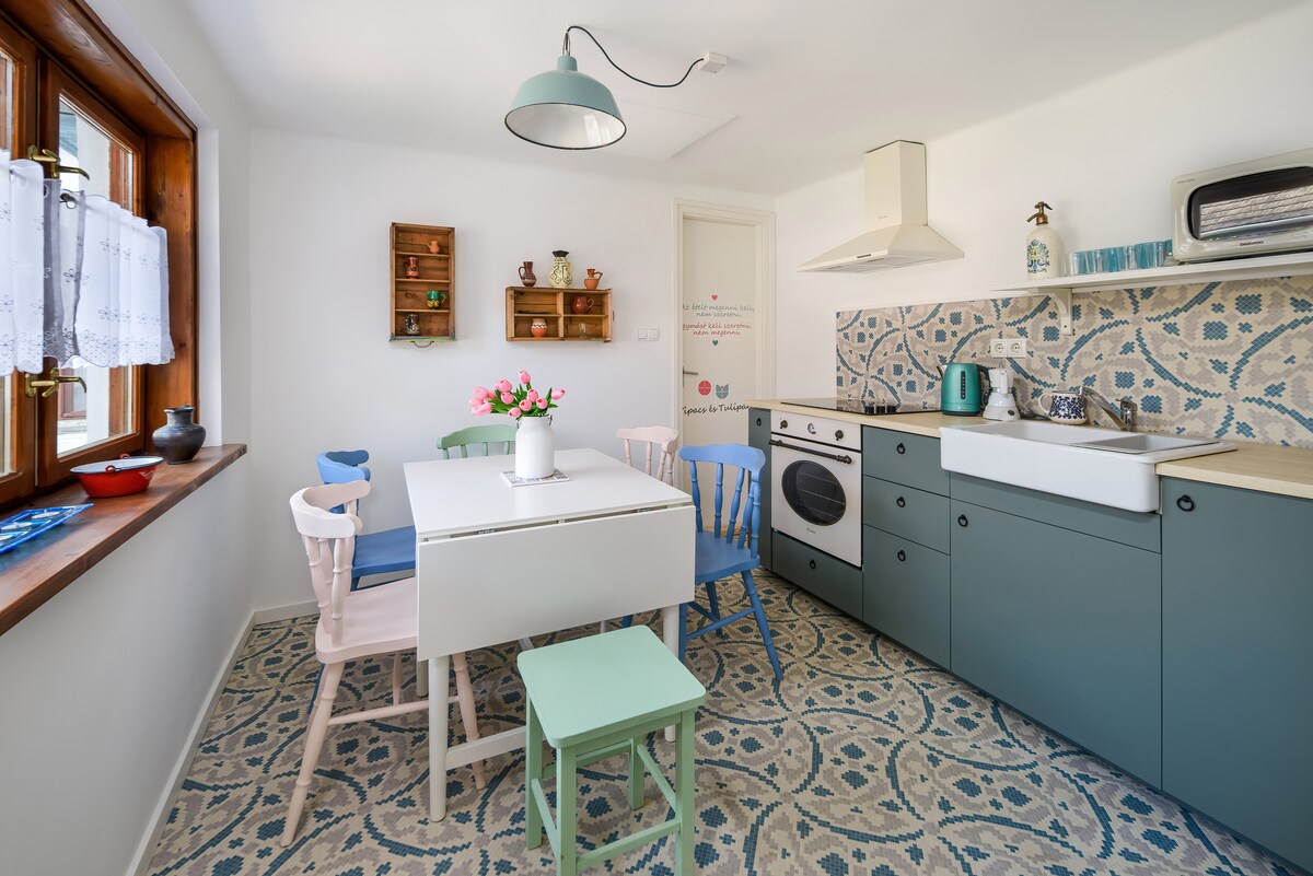 Detta hus är ca 100 år gammalt, tillhörde en fiskare och pepparbonde vid namn János Terjék. Därför, i utformningen av huset, tänkte vi på paprika - den mest kända av alla ungerska kryddor -. I valet av färger, precis som i visningen av krukor, paprika råder överallt. Förutom det bekväma sovrummet finns det även en säng för två i vardagsrummet. Framför vardagsrummet och kökets matsal finns en täckt terrass ( ambitus), som utökas med en öppen terrass.