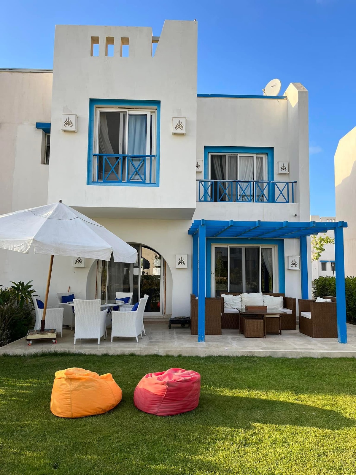 Ha kul med familj och vänner på denna fantastiska eleganta fastighet vid vattnet. Detta är en stuga med 3 sovrum som har inrättats på ett sätt för att erbjuda dig en FANTASTISK och UNIK upplevelse. Njut av det nedsänkta sittområdet från din privata trädgård bara ett par steg från det vackra kristallklara vattnet i Medelhavet. 🌊 ✨ Dags att skapa speciella minnen! 🏖️ 🇪🇬