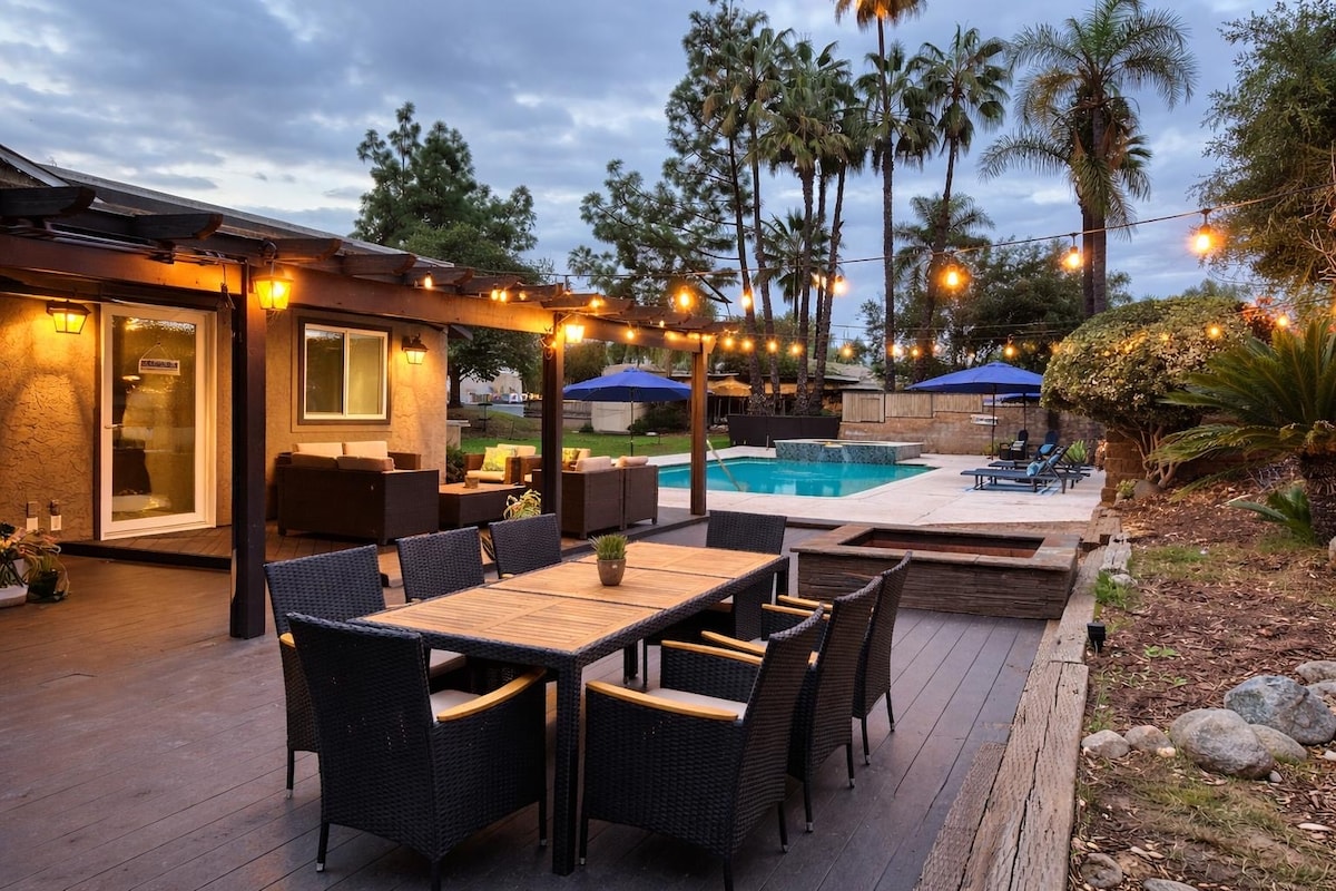 Upplev soliga San Diego från detta boende med 5 sovrum och 4,5 badrum. Vakna upp till panoramautsikt över de omgivande kullarna och samlas i de rymliga vardagsrummen och matsalarna. Boendet är bekvämt beläget bara 15–20 minuter från San Diegos berömda stränder och främsta attraktioner. Efter en dags utforskning kan du koppla av i trädgården med bubbelpool, eldstad, biljardbord och schackbräde i naturlig storlek.