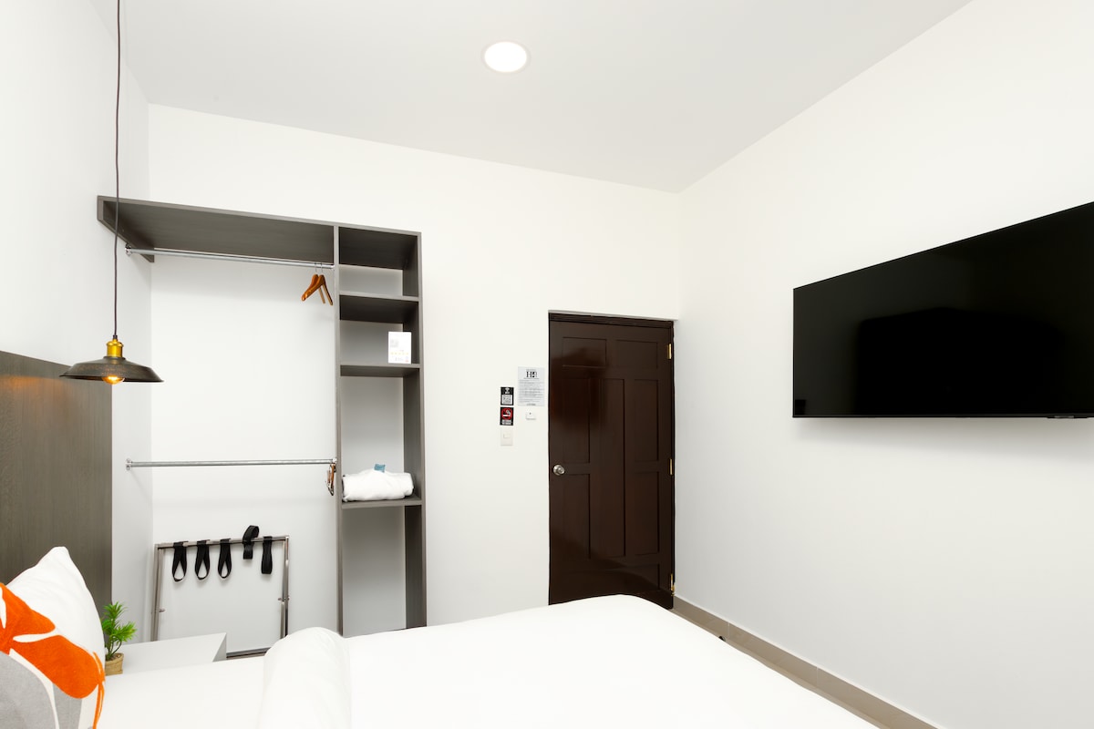 När du går in i utrymmet har vardagsrummet en liten hörnbar, perfekt för en privat arbetsyta eller en lätt måltid för två eftersom det är en intim plats. Lägenheten erbjuder ett fullt utrustat badrum för din bekvämlighet, men observera att det inte finns någon duschvärmare. Omfamna den mysiga atmosfären när du fräschar upp och förbereder dig för din dag. Sovrummet är utrustat med ett myggnät, en fläkt för att hålla dig sval, och en garderob för din bekvämlighet, vilket garanterar en bekväm och avkopplande vistelse.