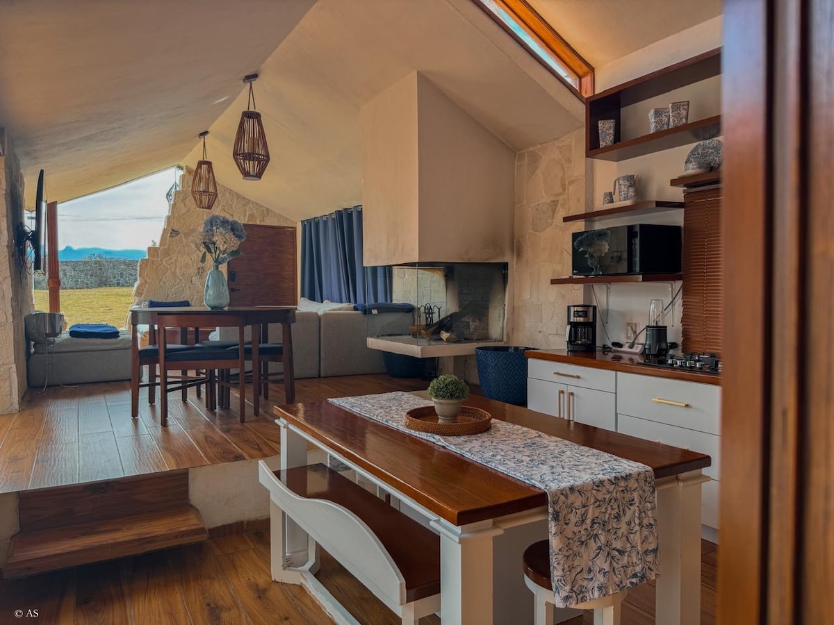 Kom och träffa den vackraste boutique-stugan i Chico National Park, modern arkitektur där järn, trä och bakad lera smälter, mitt i en skog rik på oyameles, ocotes och djurliv. En plats full av stillhet och lugn som kommer att koppla av dina sinnen och var på kvällarna sitter i elden i den öppna spisen och ett par glas vin kommer att göra en oförglömlig romantisk kväll eller på morgonen att se soluppgången tillsammans vid vår fantastiska utsiktspunkt kommer att göra ditt besök till din idealiska plats