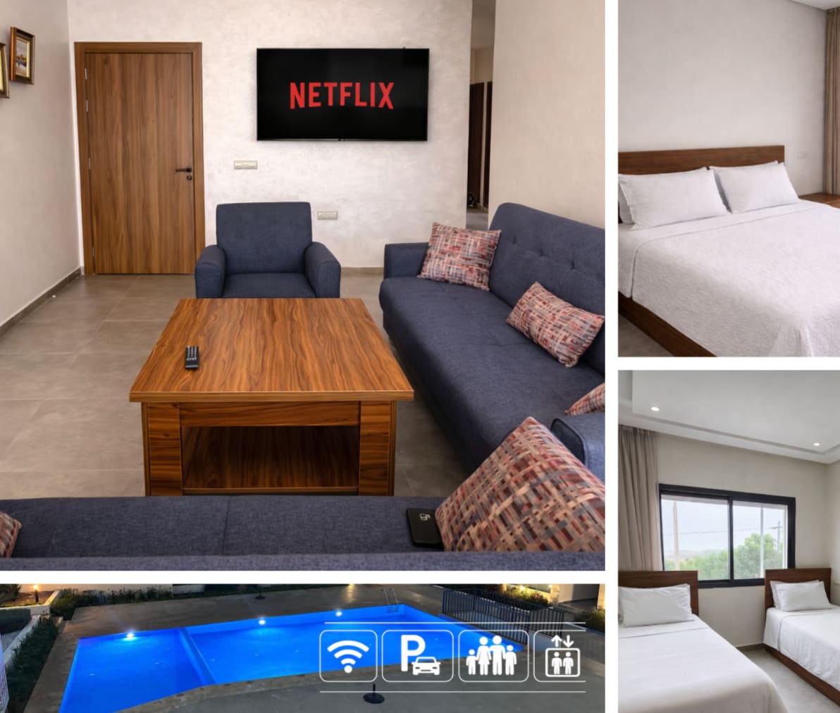 💼 Komfort och lugn i Mohammedia – perfekt för arbete och familj 🏖️ Luftkonditionerad lägenhet 2 minuter från Mansouria-stranden, perfekt för en familjevistelse eller en affärsresa. Beläget i en säker bostad med pool, nära Venisia Ice. Du kommer att njuta av ett ljust vardagsrum, ett bekvämt sovrum, ett utrustat kök och ett modernt badrum. Koppla av i en lugn, ren och vänlig miljö, en kort promenad till havet och alla bekvämligheter (kaféer, restauranger, Carrefour Market, bank)