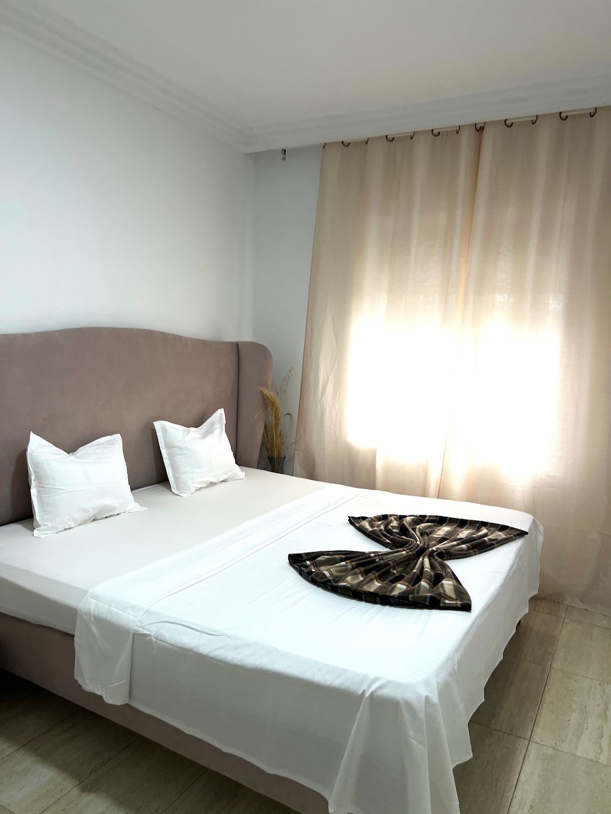 Ny, lyxig och perfekt belägen lägenhet i Ennasr, i en modern och säker bostad precis bakom Amilcar klinik. Njut av ett ljust vardagsrum med stor TV, IPTV/Netflix och en raffinerad matplats. Rummet erbjuder en premiumsäng, vacker förvaring och en andra TV. Fullt utrustat modernt kök, elegant marmorbadrum. Höghastighetsfiber, luftkonditionering i varje rum, nya apparater och privat parkering. En chic och bekväm miljö för en oförglömlig vistelse.
