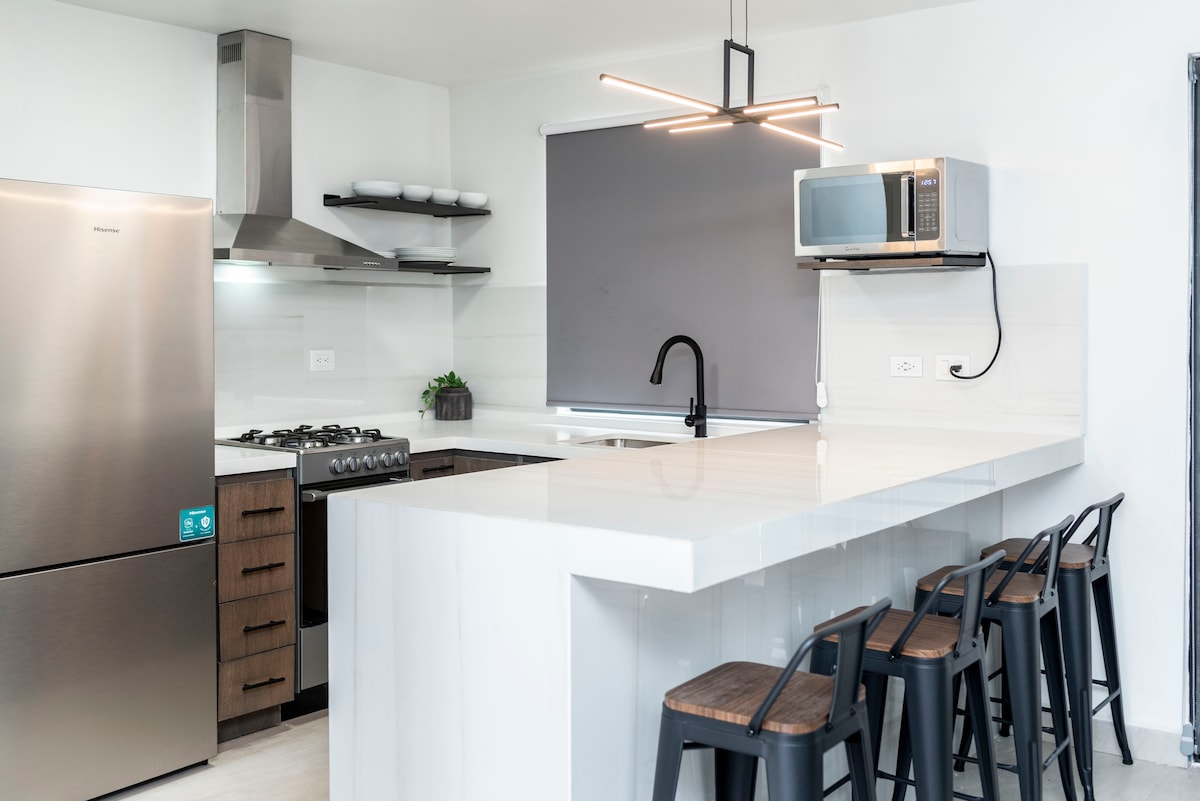Modern lägenhet i Monterrey, perfekt för medicinsk turism och affärer. Strategiskt läge en kvarter från Christus Muguerza och nära industriområdet. Inga trappsteg, med utrustat kök, tvättstuga och hotellsängar för din komfort. Lugnt område med frekvent patrullering och utomhuskameror. Perfekt för långa vistelser med snabbt wifi och funktionella utrymmen. Mer än 104 gäster ger det 4,98 stjärnor. Bo bekvämt och säkert