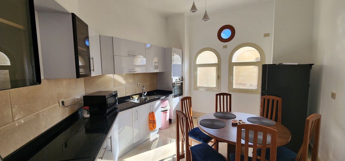 Lägenhet med ett sovrum, matrum, 2 terrasser, kök, badrum, vardagsrum, varmvattenberedare, tvättmaskin, kylskåp, ugn, spis, smart TV. Beläget i Las Cabanas Resort, Quseir Road, Marsa Alam, 2 minuters promenad till en vacker privat strand med blått vatten för bad och snorkling, strandbar, biljard och pool nära lägenheten. Ett klubbhus, Abu Ashra stormarknad, tvättstuga, basarer och butiker. Det är en 20 minuters bilresa till Marsa Alam flygplats, Porto Ghalib och Quseir.