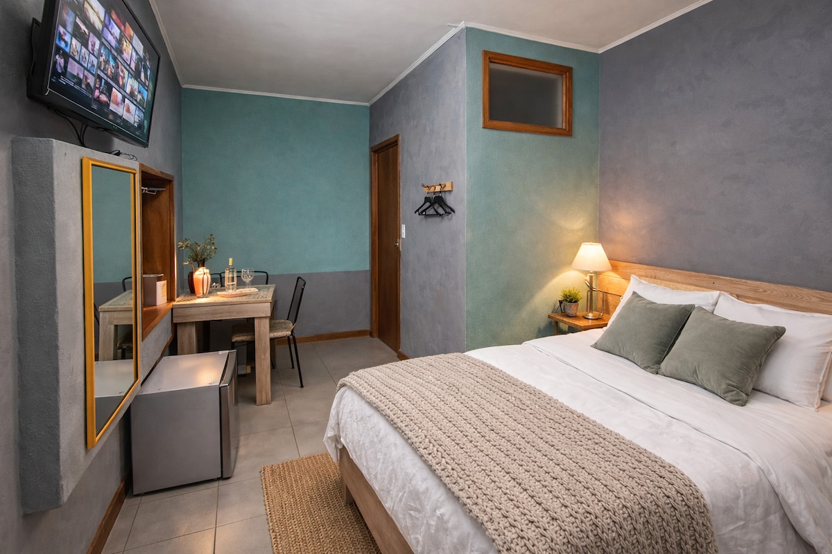 Mysig inredning lägenhet, oberoende, har 1 dubbelsäng, byrå, nattduksbord, lampa, badrum och kök, varmt vatten (värmare), kök utrustat med kylskåp, vattenkokare, kök med ugn, mikrovågsugn, redskap. Matsal för två, för att servera mat eller arbeta på dator. WIFI-område. En rymlig tak quincho och en liten pool, ett pingisbord för de flesta idrottare. Det är ett lugnt ställe, med trädgårdar, nära centrum.