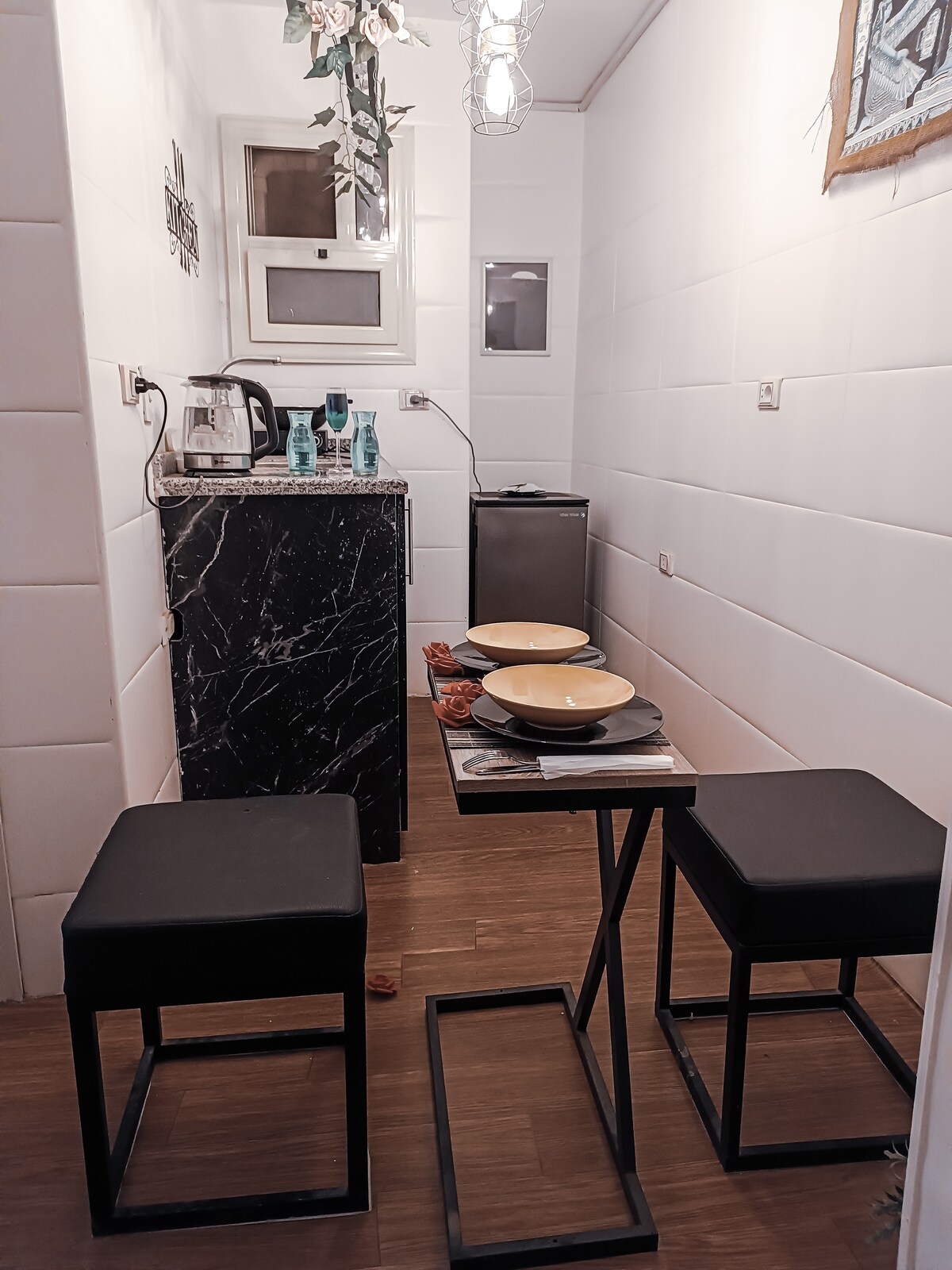 Vakna upp till pyramiderna! Ditt lyxiga 440 kvm Jacuzzi-rummet väntar, bara 5 minuter från grindarna. Sjunk ner i en dubbelsäng, fixa ett mellanmål i din minikök och njut sedan av din dag i den privata dubbla jacuzzin – allt medan du tittar på antika underverk. Fina sängkläder och moderna möbler höjer din vistelse. Incheckning efter 14:00, utcheckning senast 12:00. Perfekt för par som vill ha en oförglömlig egyptisk tillflyktsort.