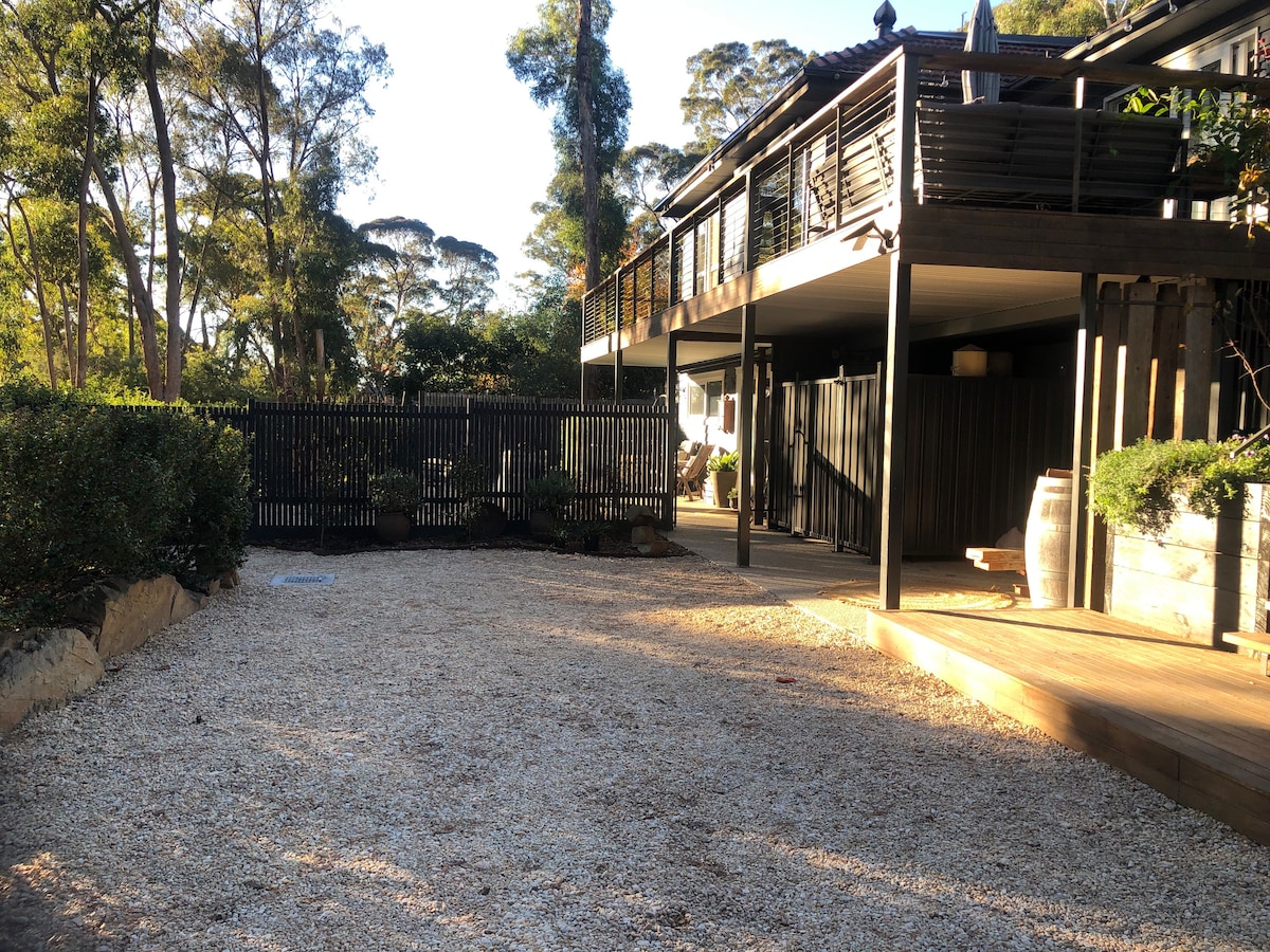 Letar du efter ett boende med god gammaldags gästfrihet, en bekväm säng med kvalitetslinne, en varm dusch och ett glittrande rent utrymme där du kan koppla av bland träd och natur medan du besöker Daylesford. Vår mysiga, eklektiska, hemtrevliga bungalow ligger ovanpå ett stort trädäck på baksidan av vårt hem som ligger inbäddat bland gummiträden och skogen med utsikt från varje fönster. Vi tillhandahåller färska frigående ägg, lokal honung, kaffe, te, mjölk och några extra skafferivaror!
