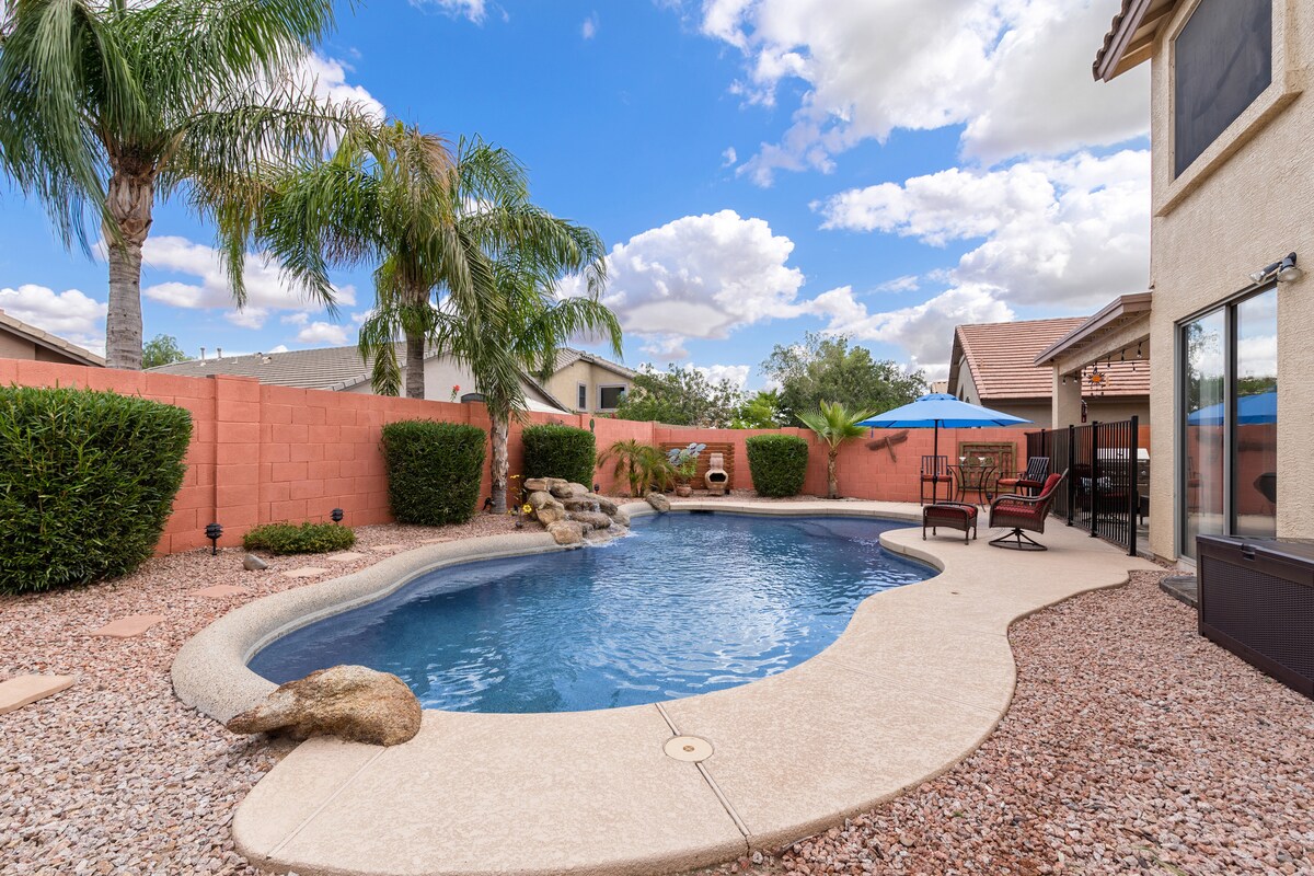 Ta med hela gänget till detta vackert inredda boende med 5 sovrum och 2 badrum i hjärtat av Casa Grande, AZ. Oavsett om du samlas med familj, vänner eller kollegor erbjuder denna ökenretreat det utrymme, den komfort och de bekvämligheter du behöver – inklusive ett fullt utrustat kontor, en stor bakgård med eldstad och grill och plats för upp till 12 gäster. Dessutom är du bara 40 minuters bilresa från Phoenix tunnelbaneområde, vilket gör dagsutflykter och tillgång till flygplatsen till en lek!