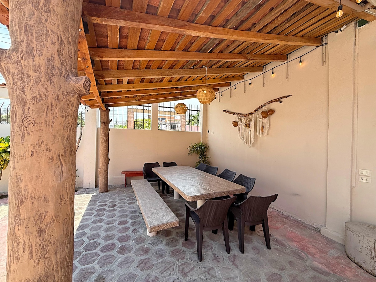 2 våningar hus som rymmer upp till 12 gäster (kostnad per person), med 3 luftkonditionerade rum, 2 badrum med varmvatten, vardagsrum, matsal och fullt kök med apparater och köksredskap, parkeringsplats inne i fastigheten för upp till 4 bilar, privat pool (enhetligt djup på 1,55mts), 2 badrum med dusch (utan varmvatten) framför palapa och en dusch till för att skölja efter stranden.