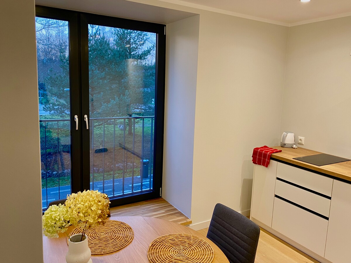 Ta en paus från den hektiska rutinen! Lägenheten, 26 kvm, är belägen i ett område omgivet av en tallskog, längs strandpromenaden. Lägenheten är fullt möblerad/renoverad med en separat del av sovrummet, badrum och ett fullt utrustat kök. Sovplats för 2 vuxna och 2 barn (en utdragbar dubbelsäng och 2 madrasser). Gästerna får tillgång till hela lägenheten i detta lugna, eleganta ställe vid havet.