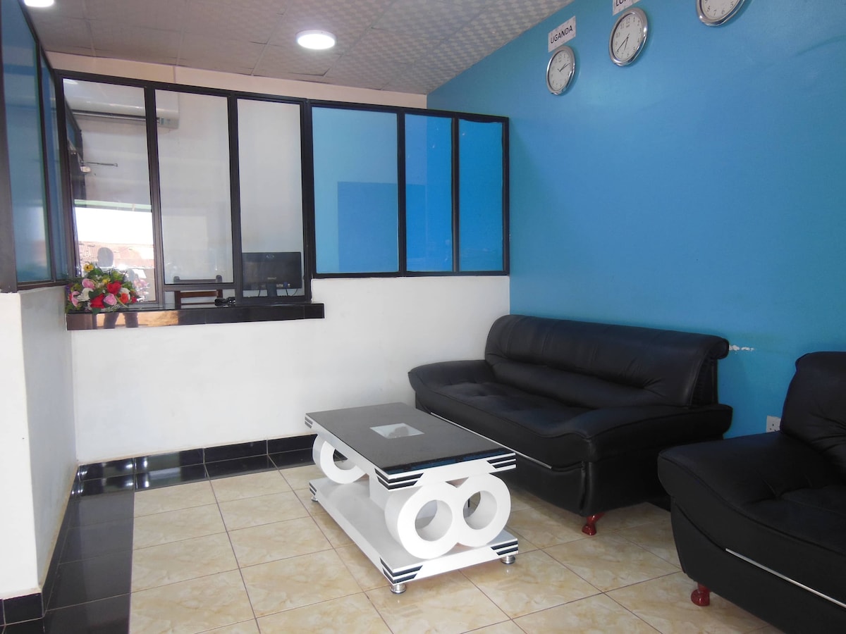 Denna rymliga svit ligger mitt i hjärtat av Kampalas stad, bara 6 minuters promenad från det centrala affärsdistriktet. Sviten är större än de flesta lägenheter i stadens centrum. A/C-sviten har ett sovrum med egen toalett, ett utökat vardagsrum, en familjetoalett och en balkong med utsikt över Kampala stad. De flesta sevärdheter i Kampala, populära barer, företag är mycket tillgängliga härifrån. SNABB WiFi, pool, restaurang, bar, daglig städservice, varmt vatten dygnet runt.