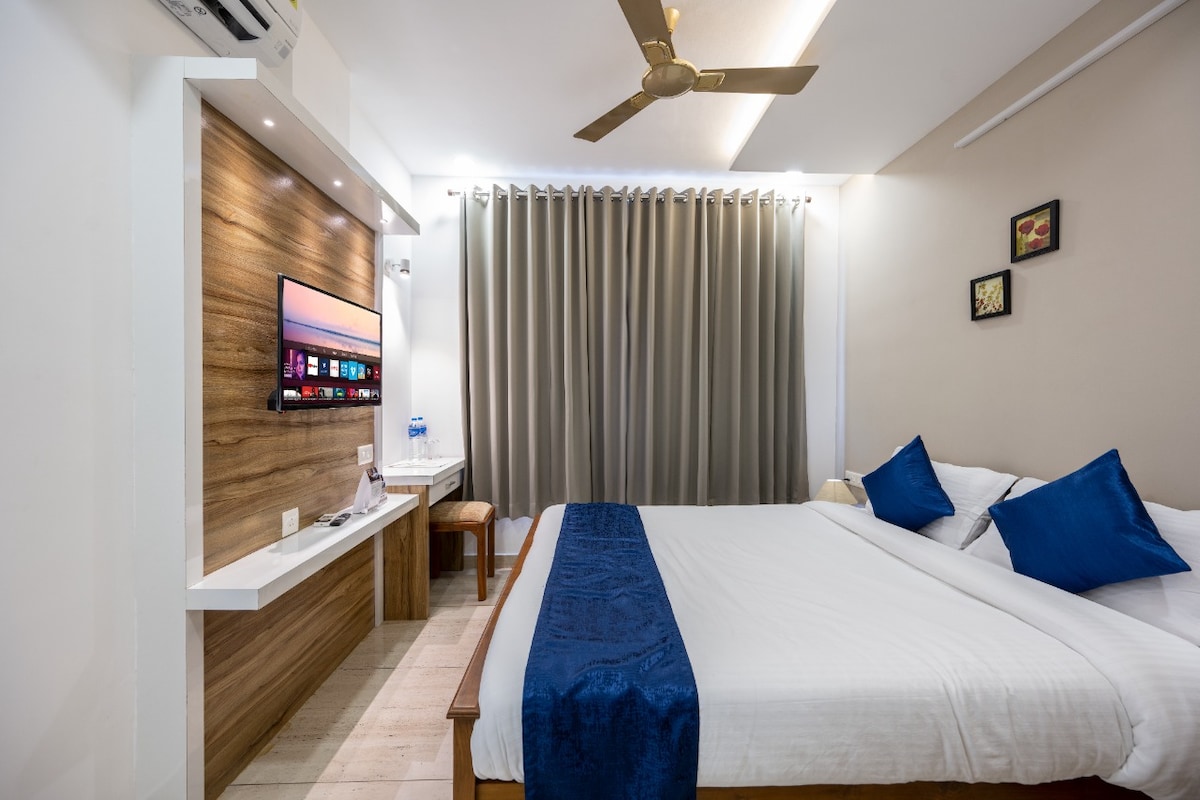 Touchdown av Nebz360 är en premium 2BR lägenhet bara 3 minuter från Cochin Intl. Flygplats. Njut av ett fullt luftkonditionerat utrymme med 2 dubbelsängar, 2 badrum, 2 balkonger med automatiska lampor, smart-TV, snabbt Wi-Fi och en kokvrå med startpaket för drycker. Inkluderar tillgång till en takpool (07.00–19.00), självincheckning, gratis parkering, hiss och rullstolsåtkomst. Väsentligheter tillhandahålls. Nära till tunnelbana och järnvägsstationer för enkla resor. Rökning endast tillåten på balkongen.