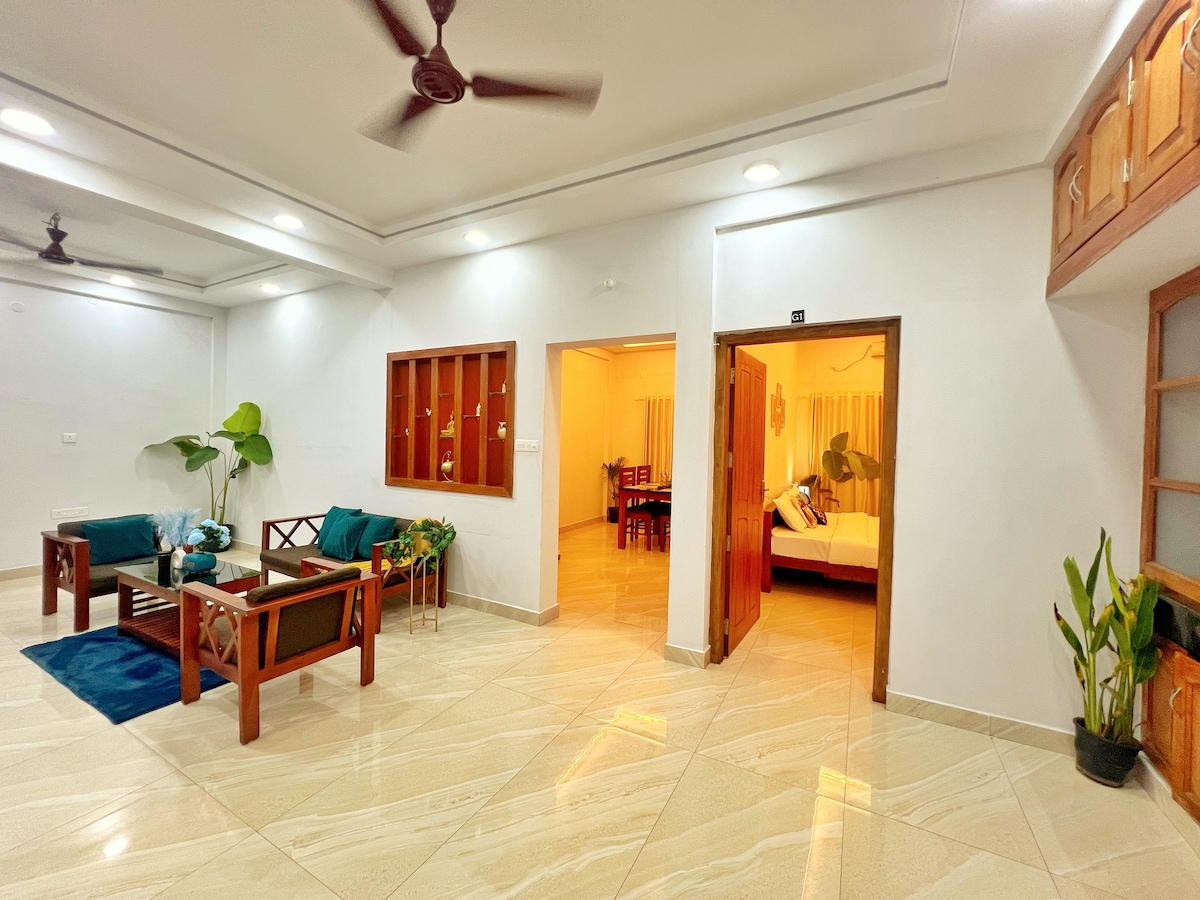 Välkommen till Haven. Detta är en fullt möblerad 3BHK-lägenhet på bottenvåningen med egen ingång, luftkonditionerade sovrum, smarta TV-apparater, ett öppet kök, en separat lounge och höghastighets Wi-Fi. Boendet inkluderar en tvättmaskin, täckt parkering och nödström. Beläget i Maradu är det bara några minuter från Fort Kochi och stora stadsattraktioner. Perfekt för en lugn och ansluten vistelse.