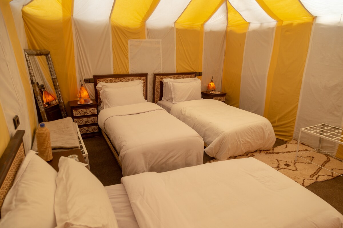 Vårt läger, inbäddat mitt i sanddynerna, rymmer 10 rymliga tält, var och en utrustad med toaletter och egen dusch. Varje tält har en individuellt låsbar dörr på insidan och utsidan, med ett hänglås som tillhandahålls utan kostnad av vår tjänst. Inne i dessa 26 kvm tält hittar ni en king size-säng och en enkelsäng, alla utrustade med högkvalitativa sängkläder, inklusive kuddar, lakan och handdukar.
