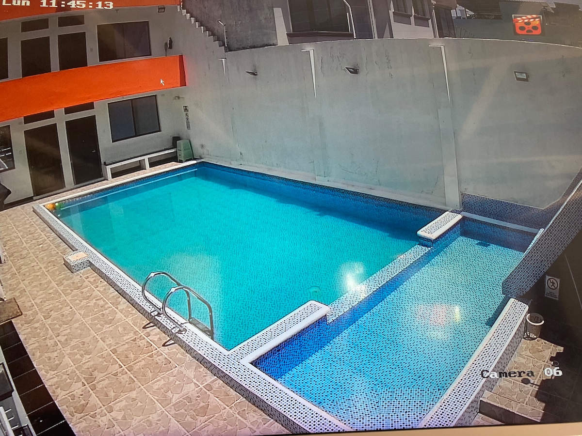det är ett utrymme med alla oberoende tjänster. Det ligger i norra delen av staden Quito. Det har ett tempererat klimat, det är 20 minuter från mitten av världen. Grannskapet är mycket säkert, huset har gröna uteplatser och en spektakulär utsikt över staden från terrassen... du kan också observera vulkanerna som omger staden från terrassen på morgnarna. Det är också 5 minuter från köpcentret " Condado shopping".