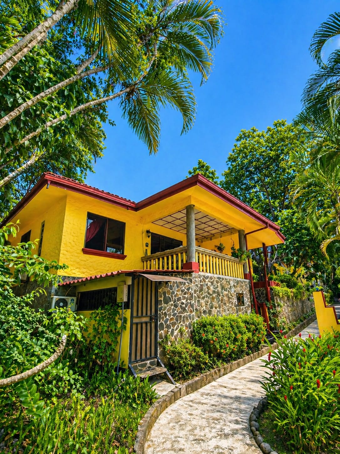 Vackert hem i en djungelmiljö instoppad i ett lokalt grannskap. Inkluderar varmvatten, tvätt, snabbt WiFi och luftkonditionering. Uteplatser inkluderar en privat pool och privat uteplats utanför huvudboendet. Upplev den lokala kulturen! Huset ligger granne med en marknad och restaurang. Minuter från allmän strand och nationalpark. Parkera på den dedikerade parkeringsplatsen utanför verandan eller ta bussen, en kort promenad från huset.