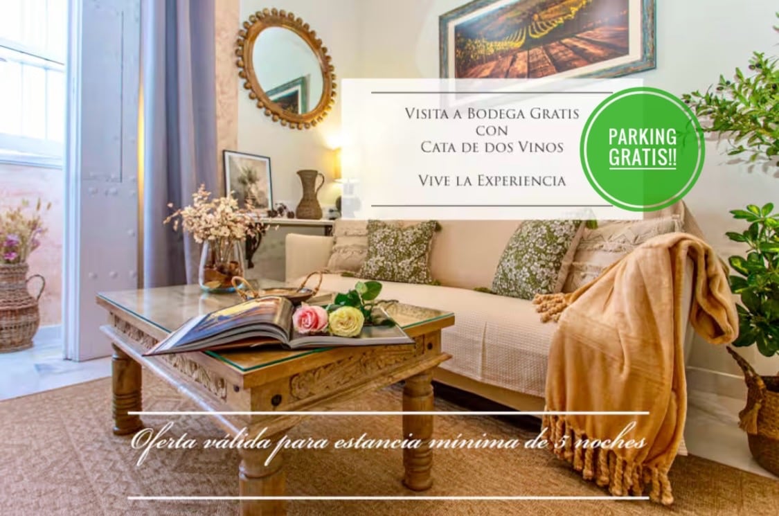 Lägenhet för vuxna och barn över 10 år. Rökning förbjuden. Parkering ingår i bokningspriset. Loftet ligger i en renoverad vingård i Jerez från 1700-talet. Det är ett vackert inrett och fullt utrustat öppet utrymme. Den ligger på bottenvåningen med hiss och har en möblerad terrass på 20 m2 under arkaderna på uteplatsen på bottenvåningen. Det är en mycket tyst plats att koppla bort och njuta av lugn och tystnad i en historisk byggnad.
