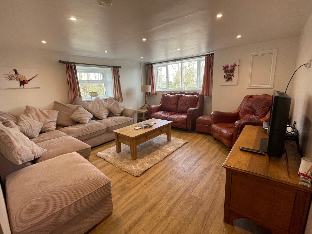 Lugn och rymlig stuga med 4 sovrum belägen på en 2 hektar stor tomt, med tillgång till nyrenoverade stall och en eldstad utomhus, perfekt för familjer och grupper. Stallet erbjuder ett stort öppet utrymme som är perfekt för middagsspel och sammankomster samt en hemmabio. Njut av eldgropen utomhus, dammen och det stora utomhusutrymmet. Färska ägg och säsongsbetonade produkter finns att köpa i den lokala självbetjäningsbutiken.