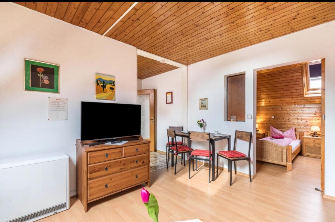 Denna 1-rumslägenhet med ett mycket lugnt läge i Hochdorf kan nås via en separat ingång. Du kan förvänta dig en dubbelsäng (140) med TV, ett välutrustat kök med kaffemaskin, Nespresso-maskin, vattenkokare, kylskåp, två spishällar, brödrost och minibakugn. Det separata badrummet har dusch, handfat och toalett. Till lägenheten hör en liten terrass i det gröna.