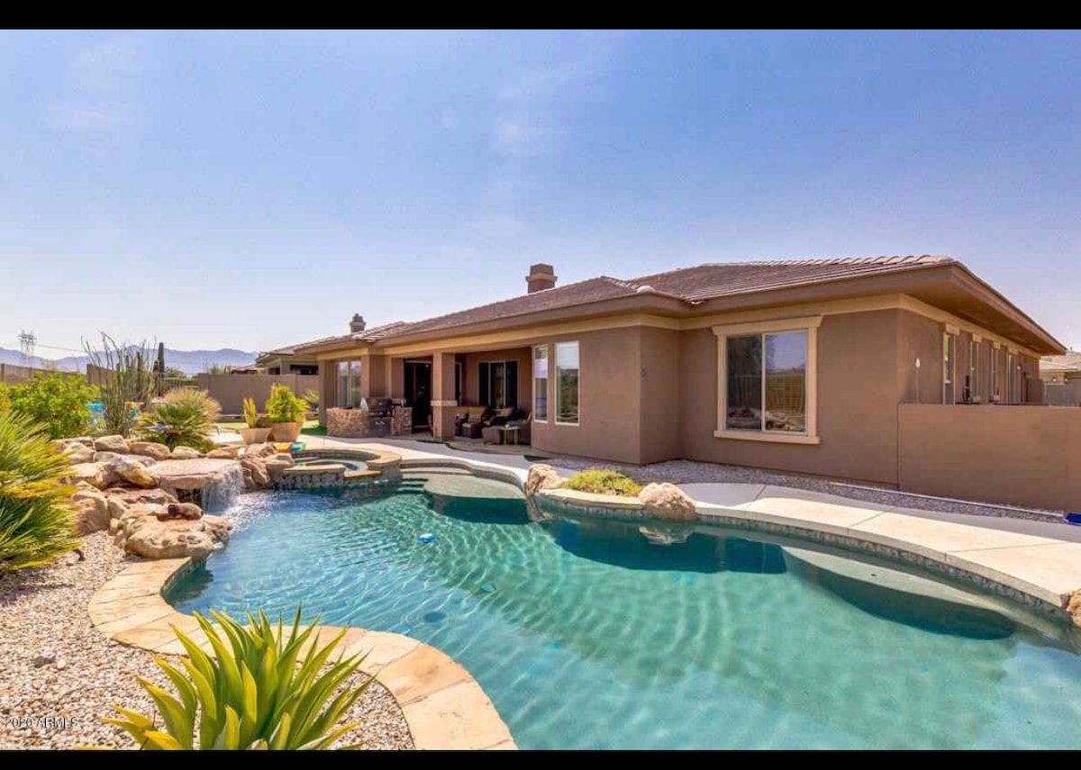 Nybyggt hus i ranchstil ligger i en lugn cirkel med utsikt över Estrella-bergen. Detta boende är vackert anlagt och har en privat pool (uppvärmd mot en extra avgift) och ett separat uppvärmt spa. Det finns 4 sovrum, 4 badrum och totalt 2 300 kvadratfot. Det finns 2 master sviter, ett 3: e sovrum, en casita med egen ingång och 1 stort huvud öppet vardagsrum som är bra för underhållning. Nära till shopping, vandring, basebollplaner, biografer och de flesta bekvämligheter.