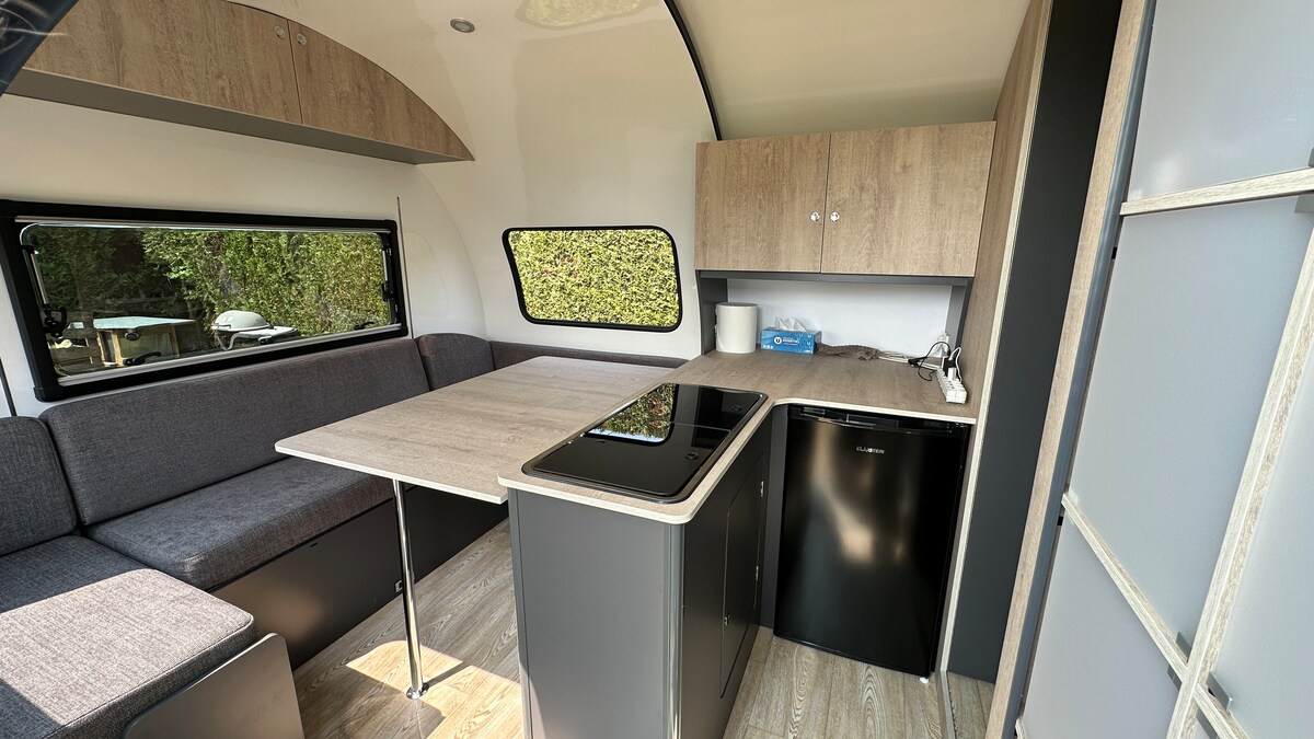 Between forests, lakes, and castles, come and relax in a private 600m² green haven with COMPLETE PRIVACY and enjoy the comfort of our unique accommodation (sleeps 4). Outside, you will find fruit trees, a mini barbecue, a tent, a gazebo, garden furniture, and sun loungers. Shopping area and bus nearby. Cleaning products provided, toilets emptied every two days, hot and cold water replenished. Next inspection (2024). Breakfast and linen rental available. Languages spoken: FR, EN, DE, ES.