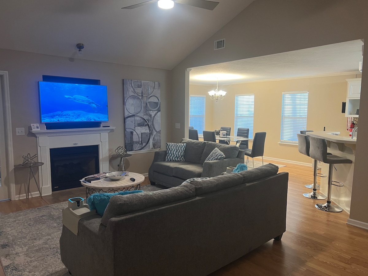 Kliv in i komforten i detta bekvämt belägna hem med tre sovrum och två fulla badrum (på kullen). Inuti finns två vardagsrum, träningsområde, fullt utrustat kök och fler bekvämligheter. Inhägnad bakgård inkluderar en saltpool i marken, gasolgrill, sektionssittplatser med eldstad, plus två fåtöljer. Varje sovrum är utrustat med 55" smarta TV-apparater att titta på från din ortopediska queen size madrass med justerbar bas. Enkla körningar till The Augusta National, Downtown, Fort Gordon och Hospitals.