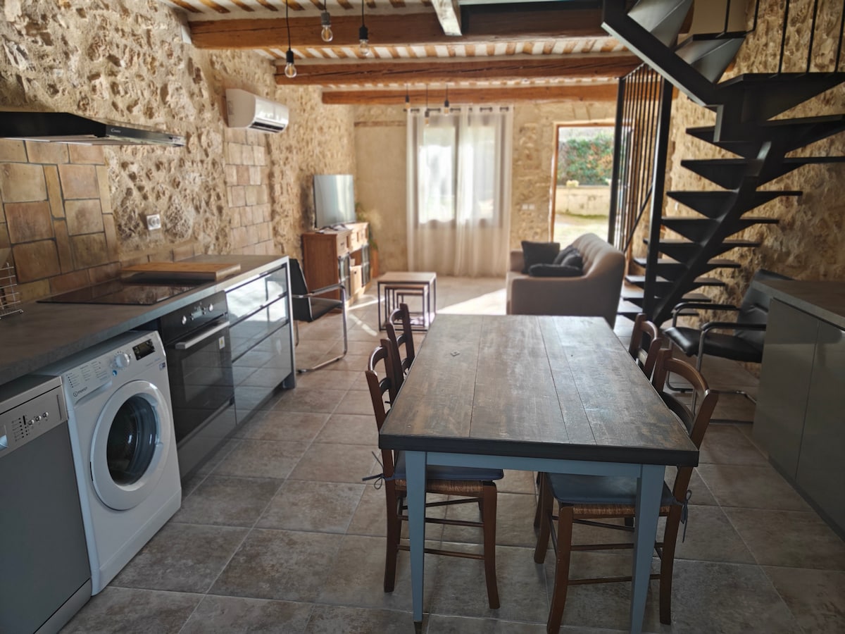 Helt renoverad bondgård som blandar äkthet och modernitet. Liten pärla belägen i en oas av lugn på landsbygden 10 minuter till fots från centrum av byn Eygalières (alla butiker) via en atypisk väg kantad med olivträd, mandelträd och provensalsk vegetation. Reversibel luftkonditionering i varje rum.