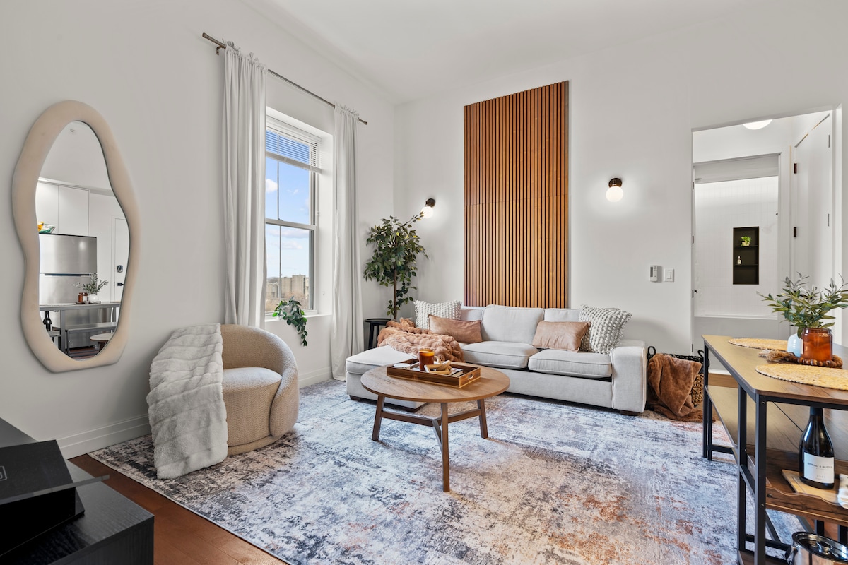 Omge dig med stil, komfort och solljus. Bekvämt beläget i centrum, erbjuder vacker utsikt över staden som skapar bara bra vibbar oavsett om du arbetar eller besöker. Lägenheten är ljus och ljus under dagarna, och mycket mysig och pittoresk på kvällarna. Rymmer bekvämt 4 vuxna. Gångavstånd till shopping, teatrar, restauranger, parker. Wi-Fi, reserverad täckt parkering, träningsanläggning och tvättstuga, säker vänlig reception
