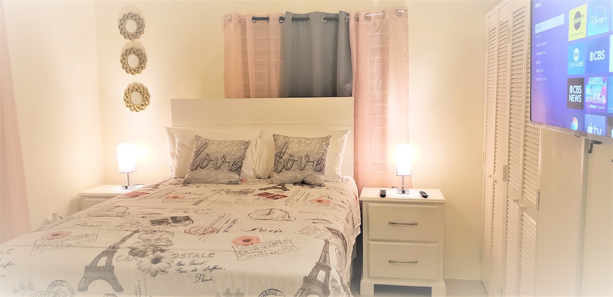 Slappna av i vårt moderna hem, där renlighet och värme fyller varje hörn. Mellan charmen i Falmouth och Martha Brae blandar vår reträtt historia med komfort: ☆Du är garanterad oslagbar kvalitet ☆ . Fläktar, luftkonditionering✔ .50''TV i vardagsrummet, 32'' i sovrummet båda med streamingtjänst.✔ .Kaffe och koffeinfritt✔ .Fullt utrustat kök✔ • Spjälsäng och barnstol✔ .Mixer✔ Superbekväm queen-säng✔ .Duschtvål, schampo och Balsam✔ . Varmvatten✔ . Modern vardagsrumssvit✔ Skicka ett meddelande till oss...
