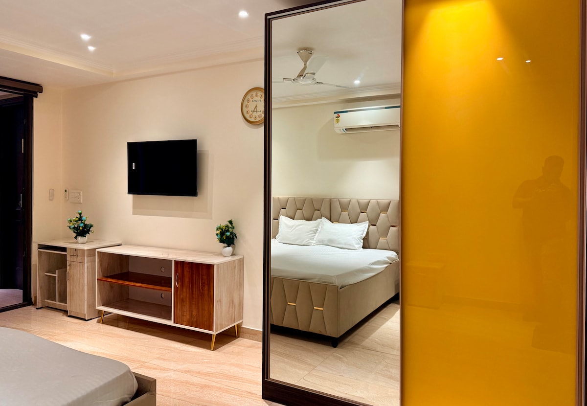 Welcome to Garden Oasis: a luxurious and sunlit, 4-bedroom ground-floor apartment in South Delhi. Just a 5 minute walk from PVR Saket, Malviya Nagar Metro, Select CityWalk, DLF Avenue and Max Hospital, yet peacefully tucked away. Featuring 4 spacious bedrooms with king-sized beds, attached baths, ACs, heaters, air purifiers, smart TVs and premium linen. Enjoy a sunlit open-plan living area, fully equipped kitchen and your own private, serene garden - a rare city escape.