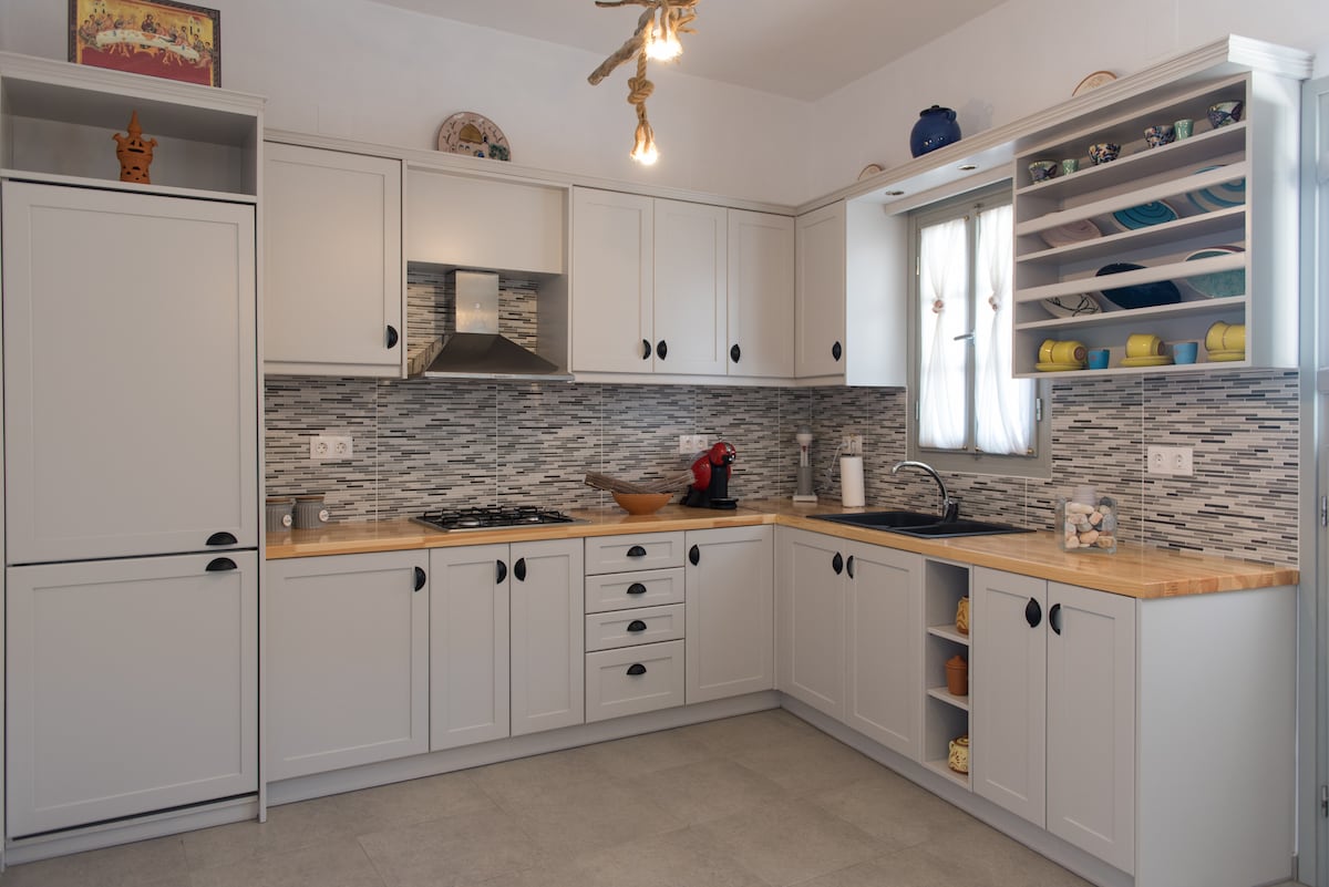 100 kvm hus och STORA VERANDOR Perfekt för 5 gäster . Den har en aircontition i vardagsrummet och en i det stora sovrummet... i barnrummet finns det ingen luftkonditionering eftersom det är norrut och solen inte ser det... är mycket nära till stranden, har obegränsad utsikt över havet och hamnen. Du kommer att älska mitt ställe på grund av utsikten, trädgårdarna. fruktträdgården, träden ( citronträd, etc.), 2 bord... stort badrum, kök. 2 mysiga sovrum. Oförglömliga fridfulla helgdagar.