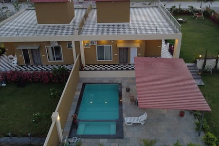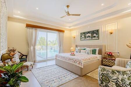 Upptäck en mysig men modern 2BHK gårdsvilla som ligger bara några minuter från Udaipur flygplats, som erbjuder den perfekta blandningen av komfort och lugn. Koppla av i din egen privata pool eller koppla av vid den större poolen i full storlek omgiven av en frodig grön trädgård. Villan har ett fullt utrustat kök för självlagnad mat, är djurvänlig och perfekt för familjer eller par. På begäran kan du njuta av autentiska Mewari-måltider i hemstil. En fridfull tillflyktsort med moderna bekvämligheter, natur och värme av gästfrihet.