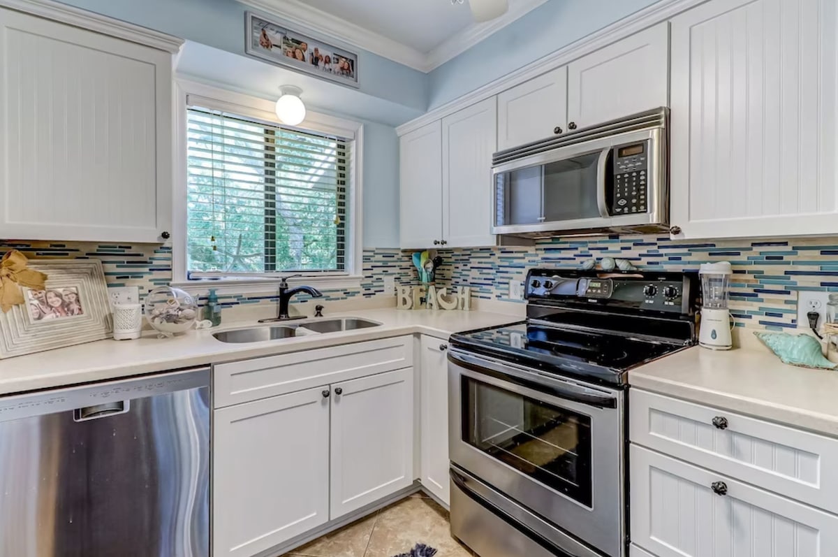 Our tranquil beach retreat, perfect for extended and short stays. Just a 5min walk from Fernandina Beach. Nearby eateries beckon, and shopping at Walmart and Harris Teeter is a short drive away. Relax into beach-inspired colors, where comfort reigns. Our cozy 2bed, 1bath abode (KING & queen beds) offers ample space with fully equipped kitchen for up to 4 guests Amenities include pool, tennis court, and a children's playground! Beach chairs, umbrella and beach cart provided within unit. <3 ^^