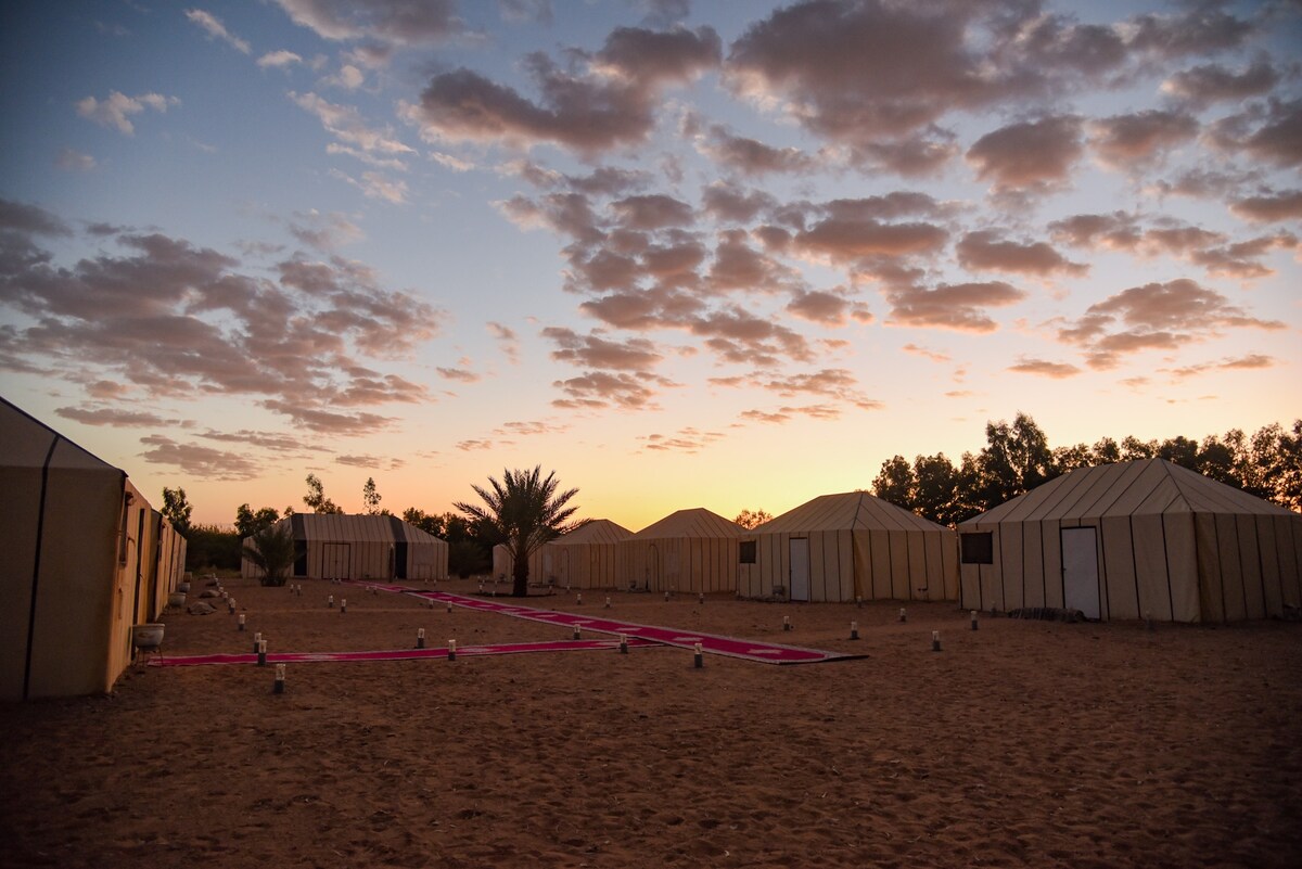 vårt privata läger har en unik detalj som skiljer den från resten. Våra tält är utrustade med de finaste bekvämligheterna, inklusive mjuka sängkläder, badrum och vackra möbler som blandas harmoniskt med den naturliga omgivningen. Våra expertkockar kommer att skapa utsökta måltider åt dig, med lokala smaker, samtidigt som de tar emot eventuella kostpreferenser eller restriktioner. På kvällen kan du njuta av en sprakande lägereld, där du kan koppla av och njuta av lugnet i Sahara