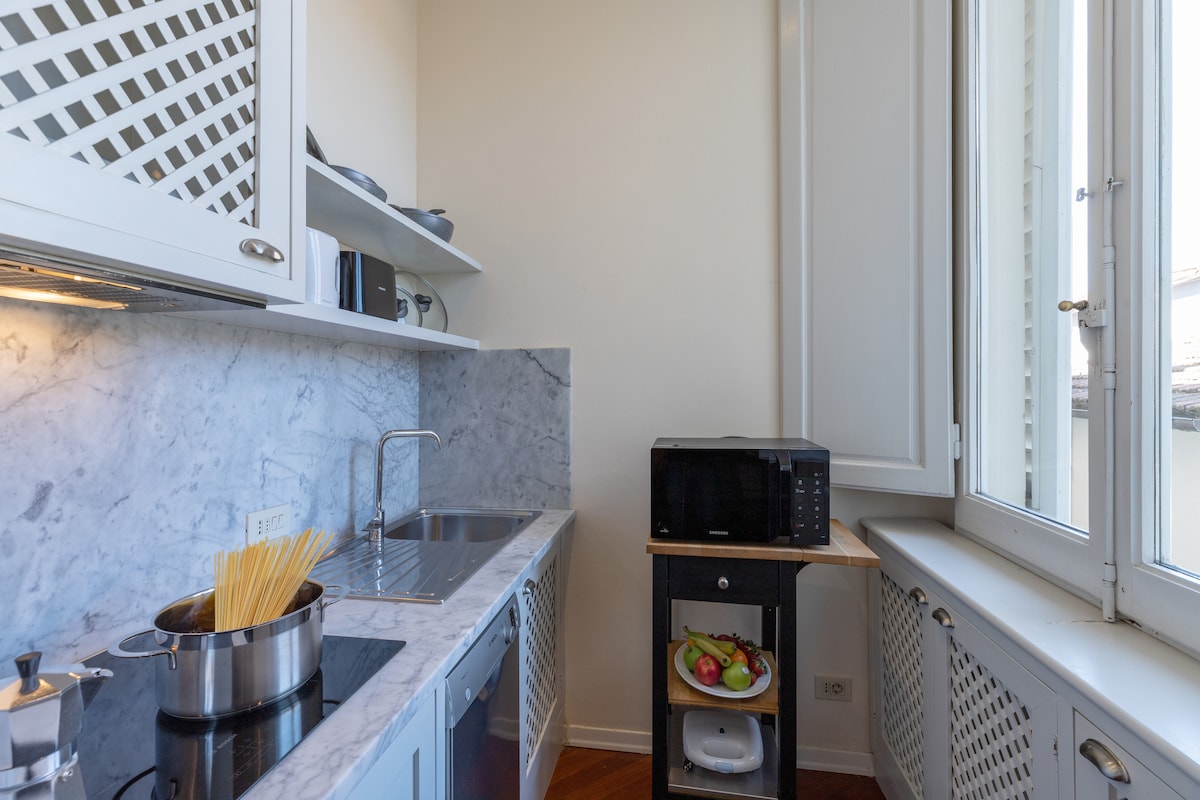 Fördjupa dig i en designmiljö med rätt kombination av moderna och antika element. Två sovrum, två badrum med dusch, kök, stort vardagsrum med bäddsoffa och en liten trädgård. Enkel parkering framför huset. Många små detaljer som fotografier, konstverk, kuddar, ljus och böcker ger personlighet åt miljön. När du kommer tillbaka från dina utflykter, koppla av och ta en aperitif i den vackra trädgården på baksidan. Lägenheten på 100 m2 ligger på bottenvåningen i en gammal villa på Via di San Domenico 37 som leder från Piazza Edison i San Domenico till Fiesole. Huset ligger i Via di San Domenico, en lugn och privat plats; på ena sidan vetter den mot en liten trädgård och på den andra sidan mot en tyst och skyddad innergård som tillhör oss. Lägenheten är ny, renoverad med smak och elegans. Perfekt för två par vänner och för en familj med barn. Den rymmer upp till 7 personer. Lägenheten består av: stort vardagsrum med bäddsoffa och möjlighet att lägga till en extrasäng; ett vackert stort och ljust kök med matbord med utsikt över trädgården; ett första sovrum med dubbelsäng, luftkonditionering, utsikt över trädgården och eget badrum med dusch; ett andra dubbelrum med luftkonditionering och utsikt över innergården. Ett andra stort badrum med dusch. Lägenheten kompletteras med en liten trädgård till ditt förfogande, rik på växter och blommor, där du kan njuta av frukost, lunch och middag. Ni är välkomna till vår lägenhet, golven är i ekparkett och väggarna är målade i en delikat nyans av duvgrå. Vi har renoverat och inrett denna lägenhet med stor omsorg och uppmärksamhet på detaljer. Du hittar lakan och handdukar; tvål, skumbad och hårtork; strykjärn och strykbräda. Köket är stort och ljust, modernt och fullt utrustat med kylskåp, spis, ugn, mikrovågsugn, kaffemaskin, vattenkokare och brödrost. Gratis wifi. Framför huset, på Via di San Domenico hittar du gratis parkering. Alltid på Via di San Domenico, 100 m från vårt hus, hittar du busshållplatsen 7 som tar dig till centrum på 15 minuter. Här har du möjlighet att koppla av när du återvänder från dina utflykter till Florens, Fiesole och Settignano, Mugello och Chianti. Dina lurviga vänner är också välkomna! Gästerna har tillgång till lägenheten och den privata trädgården som är reserverad för dem. Min man och jag kommer att vara glada att välkomna dig och hjälpa dig under din vistelse! Vi är också alltid tillgängliga via sms och whatsapp. Lägenheten ligger mellan Campo di Marte, Cure och den charmiga och andliga atmosfären i San Domenico och Fiesole, i ett välordnat och elegant bostadsområde, där du kan andas den typiskt florentinska livsstilen. Förutom den underbara historiska stadskärnan i Florens, rekommenderar vi en tur i de shoppinggator som är intressanta för oss medborgare, såsom: Via Gioberti, Via Marconi, butikerna och marknaden i Cure-distriktet. Vi föreslår också att du går uppför Via di San Domenico och når Fiesole för att besöka de underbara historiska villorna som ligger längs denna kulle; en väg som kommer att erbjuda dig unika landskap och intryck! Vi har ingen privat parkering, men framför fastigheten, på Via di San Domenico hittar du många tillgängliga och gratis parkeringsplatser. Framför lägenheten hittar du också busshållplatsen för buss nr 7 som tar dig till centrum på 15 minuter. Observera, för de som kommer utan bil: det finns inga stormarknader i närheten av lägenheten som du kan nå till fots, så vi rekommenderar att du köper det du behöver nära stationen (du hittar många city market). Lägenheten ligger mellan Campo di Marte, Cure och den charmiga och andliga atmosfären i San Domenico och Fiesole, i ett välordnat och elegant bostadsområde, där du kan andas den typiskt florentinska livsstilen.