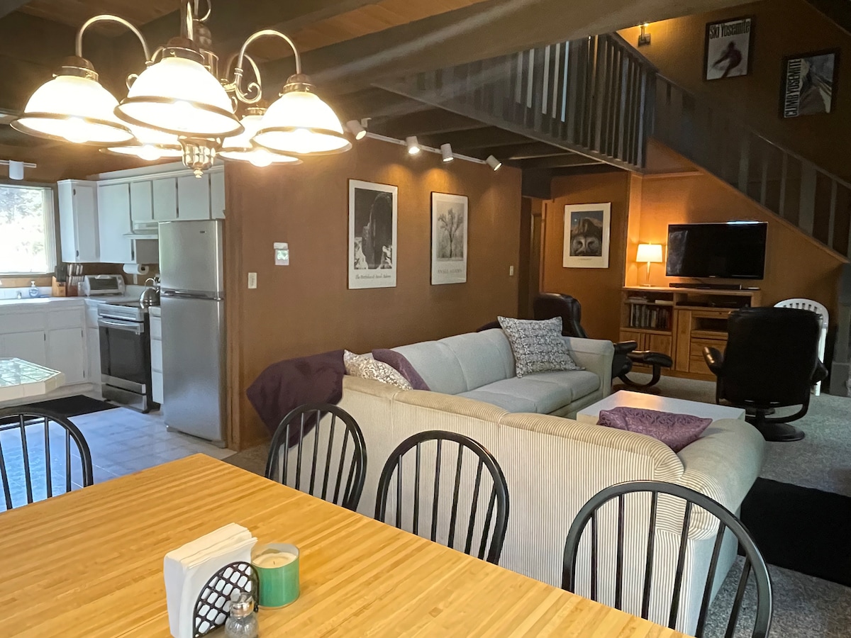 Perfekt hemmabas för att vila och ladda upp mellan allt äventyr och utforskning detta vackra område har att erbjuda! - 3 mysiga sovrum (1 king på övervåningen, 1 queen, 2 dubbelsängar) - 2 badrum (1 på övervåningen, 1 på nedervåningen) - Utomhusutrymme - Uteservering och grill - Kök med helt NYA vitvaror i rostfritt stål - Rymligt och inbjudande bra rum med 65" smart-TV - Familjevänligt – pack-n-play, läsplats på övervåningen, barnservis - Invändig tvättmaskin / torktumlare - Snabbt WIFI