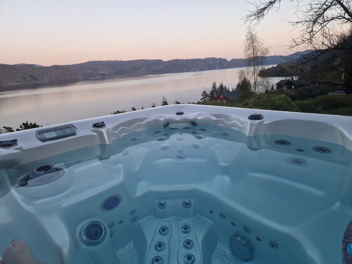 Ladda upp din lyx i detta unika och lugna boende. Härlig romantisk liten stuga med en utsikt som ger sinnesro. Stor terrass/brygga med utemöbler, gasolgrill och vedeldad bubbelpool! (VIKTIGT! Badtunnan har INTE bubblor eller massage, bara utsökt varmt vatten). Inne finns ett sovrum med en dubbelsäng, badrum med toalett och dusch, kök med all nödvändig utrustning och vardagsrum med TV. Loft/loft med 2 enkelsängar, 1,80 takhöjd. Gratis SUP-BRÄDA och liten kajak.