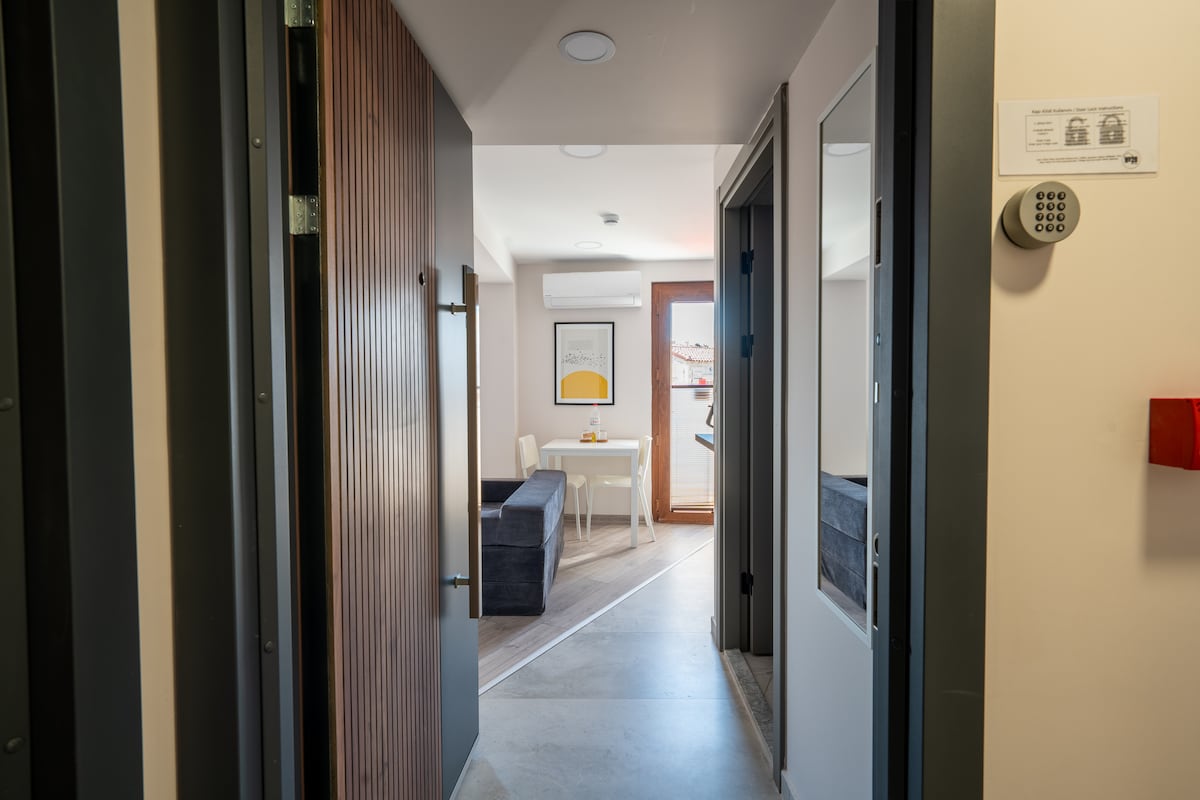 Välkommen till vår Superior Studio Suite-lägenhet, belägen i det lugnaste hörnet av Yeni Foça, bara några steg (50 meter) från havet, som kombinerar modern komfort med värmen från Egeiska havet! Denna privata lägenhet ligger på entrévåningen (trädgårdsvåningen) och är utformad för både barnfamiljer och affärsresenärer, med sin rymliga utformning som öppnar direkt ut mot omvärlden utan krångel med trappor.