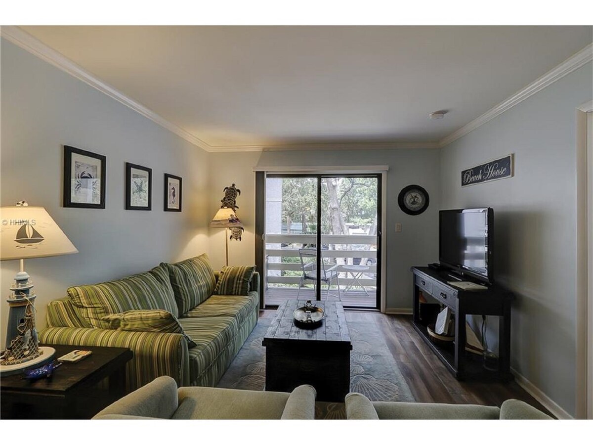 Stay in a unique, quiet beachfront neighborhood for your vacation on HHI. Enjoy a 5 minute/2 block WALK TO THE BEACH, 2 FREE bikes, Roku with NETFLIX, and a mid-island location for easy access to local attractions. Step inside to a bright, super clean, well stocked place with all of the comforts of home. Outside, you are surrounded by Live Oaks and natural landscaping. The apt. features LR/kitchen combo, 1 bedroom w/ a queen bed, full bath, W/D in walk-in closet, and a deck w/ seating.