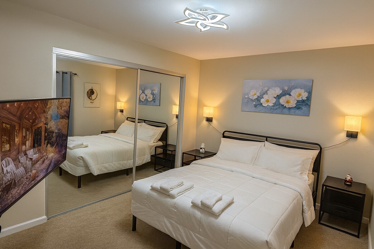 Bo i vårt fridfulla hem beläget i Foothill Farms-området i Sacramento! Nära till I 80 Fwy och mindre än 20 minuter från sjukhus och gallerior. Target & Walmart och olika restauranger (In-n-Out, Chick-fil-A, Sushi, etc.) 13 mi/20 minuter från Sac Airport Tillhandahålls en ombyggd 2 säng 1 badrum duplex, w/ rymligt vardagsrum och sovrum. Nytt kök och matplats. Vardagsrummet har en bekväm soffa, 55" smart tv och ljus atmosfär. Rum 1 King Puffy luxe-madrass Rum 2 Queen fast madrass, arbetsyta