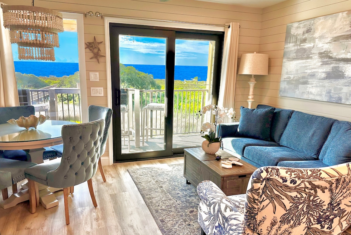 Denna villa på 2: a våningen har hisnande, fri havsutsikt från vardagsrummet och sovrummet. Promenera till Coligny! Sviter med två sovrum (nya madrasser och takfläktar), med separata renoverade bad. Vackra lönnlövträ & kakelgolv överallt. Fullt utrustat kök har bänkskivor i granit, lönnskåp och vitvaror i rostfritt stål. Ny tvättmaskin/torktumlare. Jim säger "Jag bor personligen i var och en av mina enheter för att säkerställa att de upprätthålls till min högsta nivå av förväntningar."