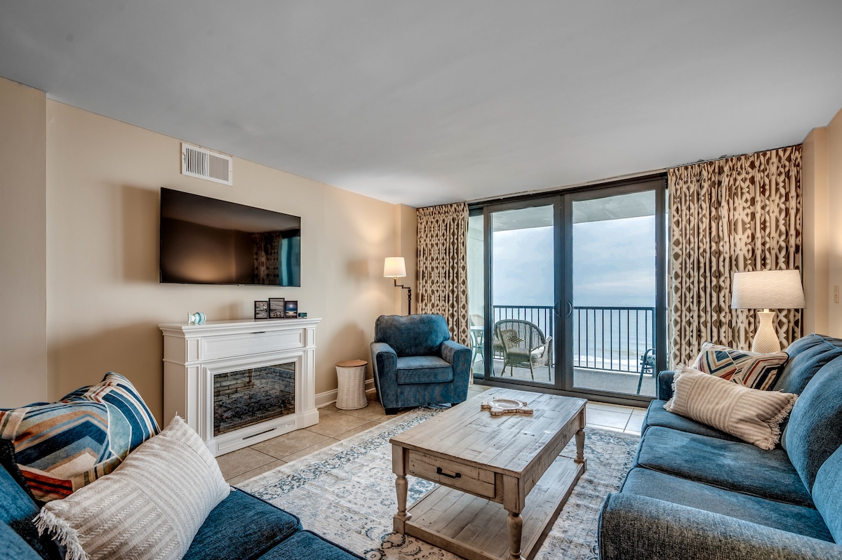 SUMMER IS HERE. DON'T MISS BOOKING YOUR STAY!!! Experience breathtaking ocean and sunset views from our Super Clean, 5-star rated condo on the 9th floor. "OCEAN VERDE" is a spacious 1-bedroom layout with a king size bed, full kitchen, large balcony, smart TVs and a fireplace. Washer\dryer located inside the condo. Located in a prestigious area of Myrtle Beach known as the Golden Mile, minutes away from restaurants, shopping, and attractions. Book Now for the ultimate MB getaway!